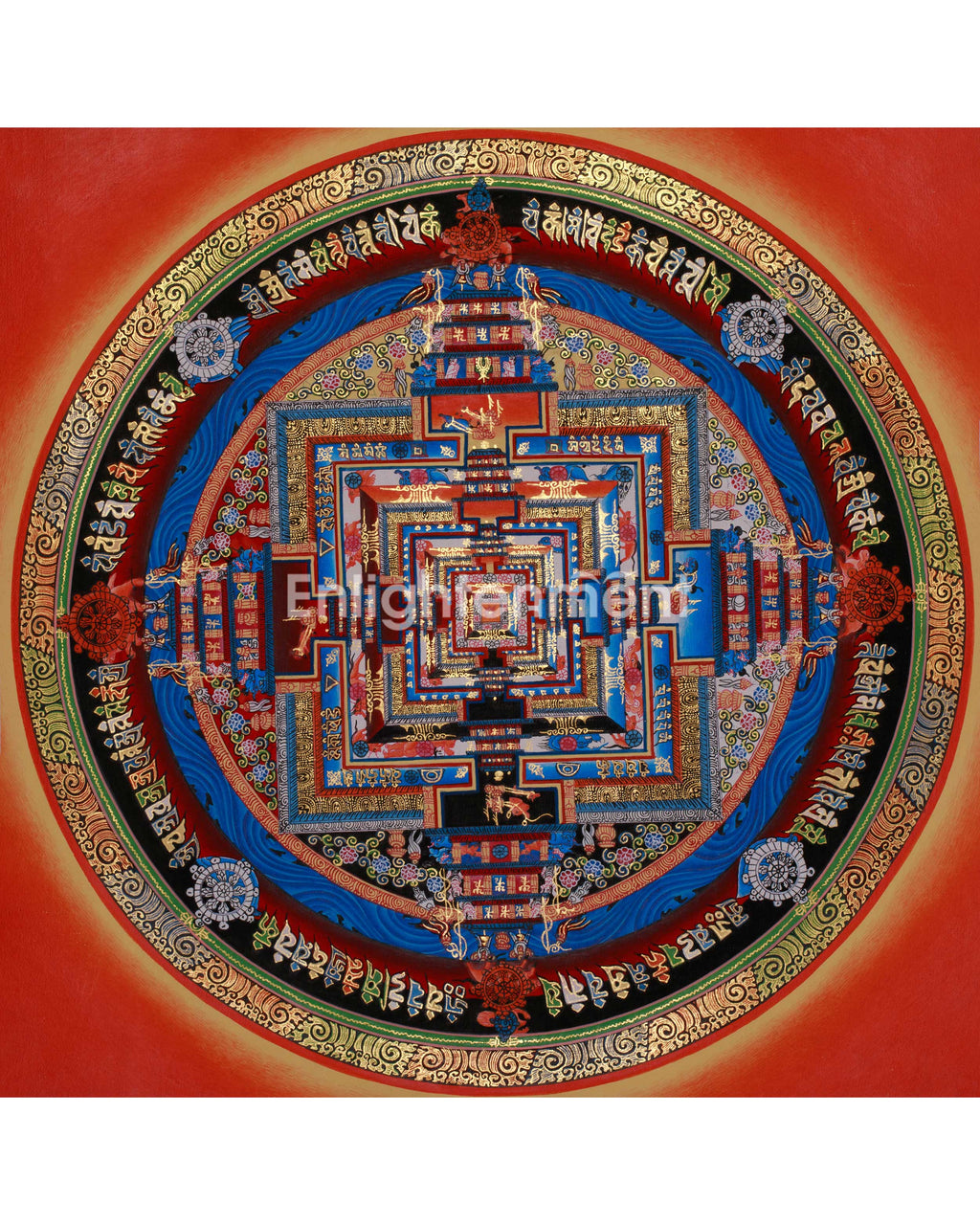The Gold Kalachakra Mandala is a hand-painted thangka that symbolizes time, cosmic order, and spiritual transformation in Tibetan Buddhism. It is created on high-quality cotton canvas using acrylic colors and genuine 24K gold, ensuring both spiritual authenticity and enduring beauty. The mandala showcases a sacred wheel of time with concentric circles and vibrant hues. The symmetrical patterns represent the connection between the material and spiritual realms, while the striking red, blue, and gold tones illustrate the transformation of inner turmoil into wisdom and peace.