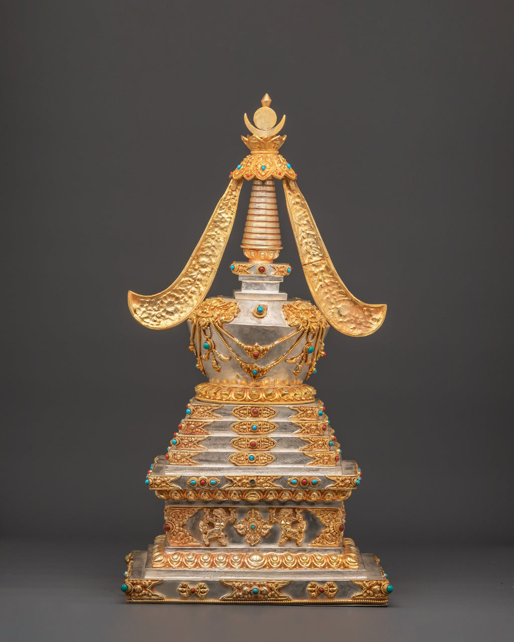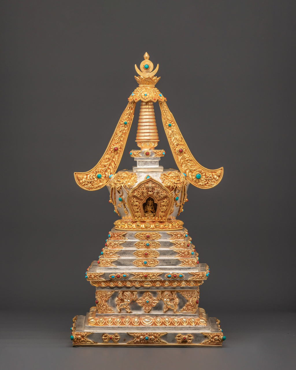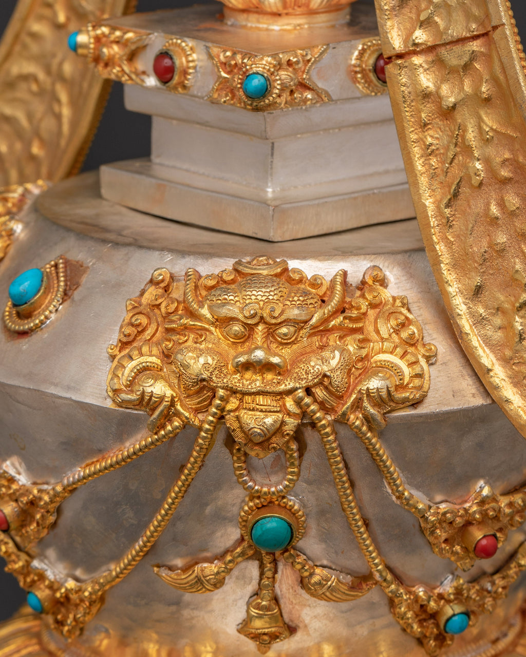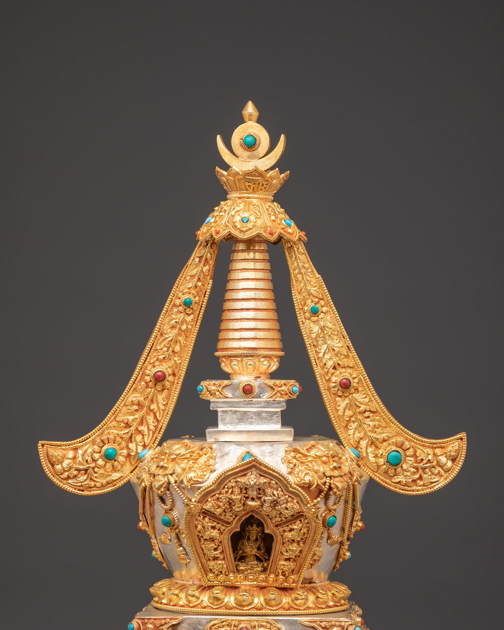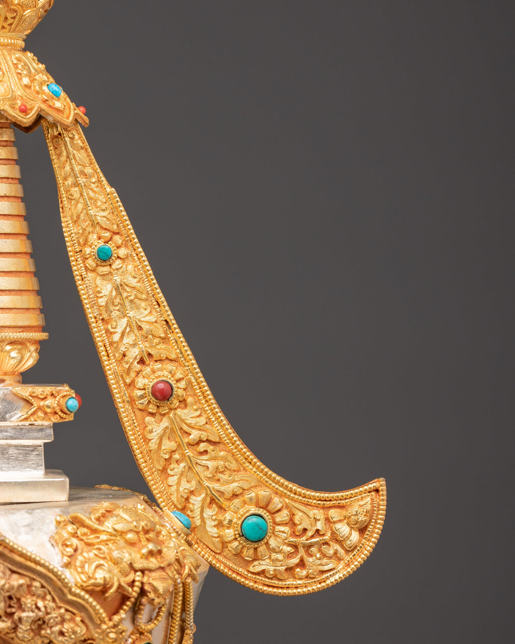 Immerse yourself in the mystical air of Tibetan Buddhism with this majestic gold-plated Buddhist Shrine Stupa, which represents enlightenment, protection, and spiritual harmony. Standing 55cm tall and 29cm wide, this finely carved stupa is crafted from copper and richly plated with gold and silver, creating a stunning visual contrast and a brilliant finish. The intricate craftsmanship includes inlays of brilliant turquoise and coral artificial stones, which are valued in Tibetan culture for their protective and healing properties. This stupa not only serves as a spiritual focal point for prayer, meditation, and ritual offerings, but it also exemplifies the intricate craftsmanship of traditional Himalayan artwork.