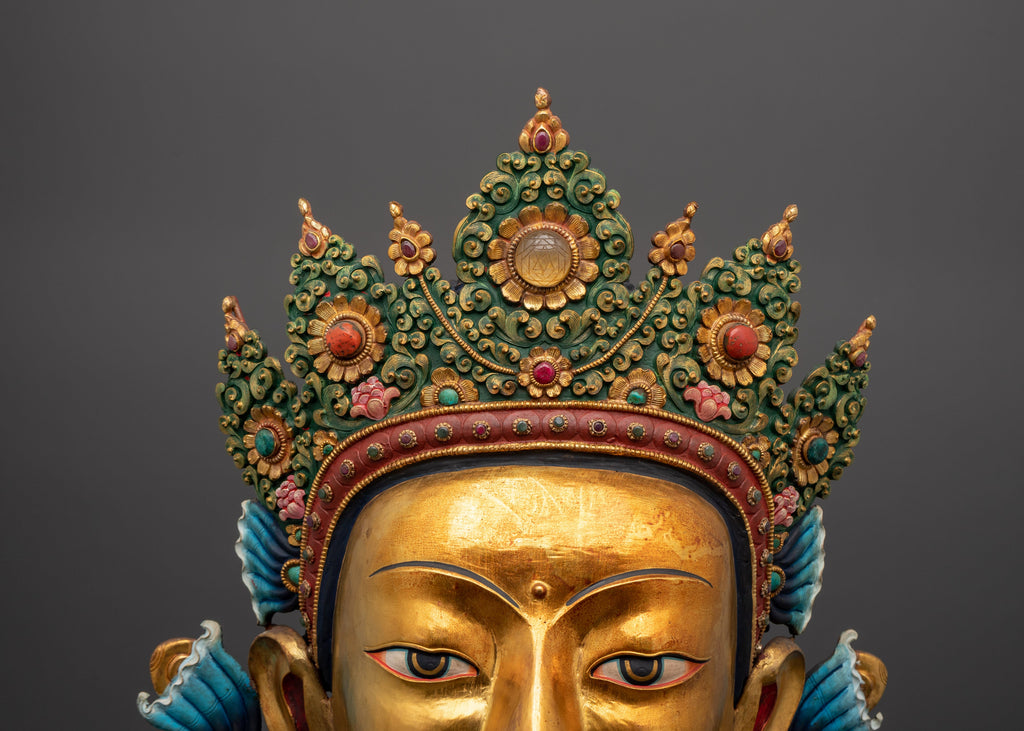 The shining crown is embellished with flowers and a treasured design, which reflects the Buddha's royal and spiritual attributes. With tranquil eyes, delicate lips, and a beautiful smile, this sculpture exudes calm, making it excellent for meditation rooms, altars, or spiritual shrines.