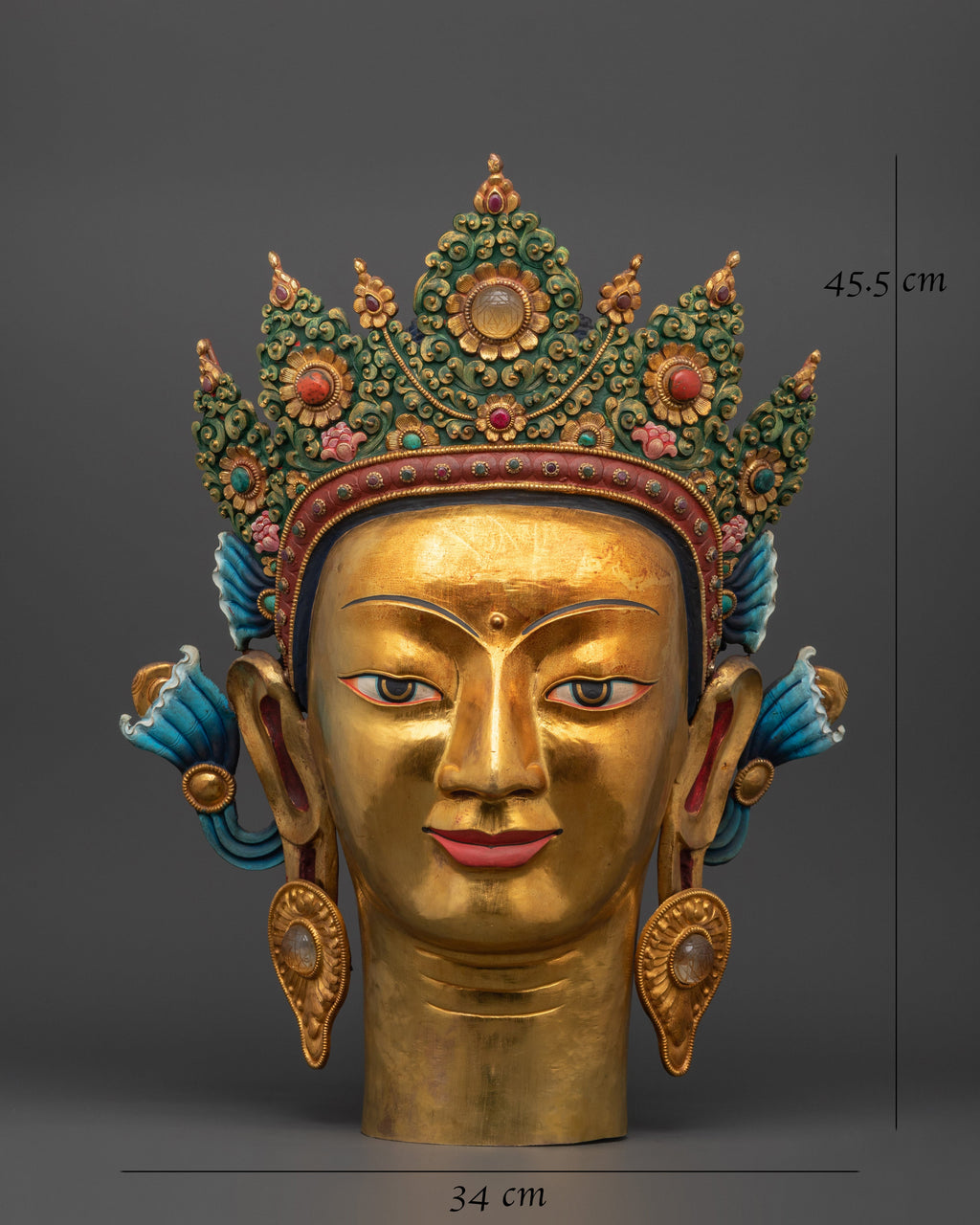 This majestic Buddha head sculpture is a powerful representation of enlightened wisdom and serenity. Standing 45.5cm tall and crafted from copper, it is richly gold-plated and meticulously hand-painted with acrylic colors, bringing every facial detail and jeweled crown to life.