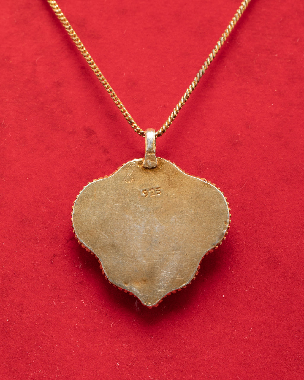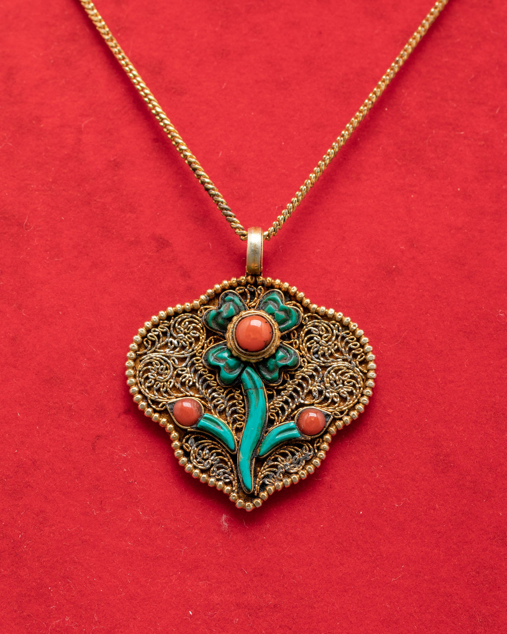 This Gold Plated Flower Locket is a beautifully designed piece of jewelry made from silver, plated with radiant gold, and adorned with coral and turquoise stones. The intricate flower design symbolizes growth, beauty, and the unfolding of life’s potential, making it a meaningful accessory for both style and spiritual connection.