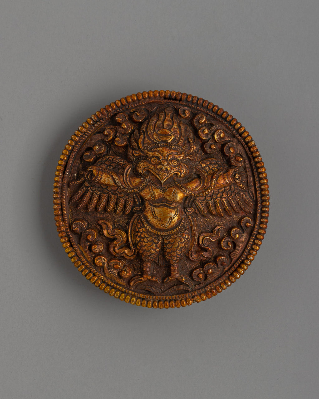 Every aspect of this buckle is precisely made by expert artisans, resulting in a high level of accuracy and elegance. The gold plating showcases its intricate design, from the spread wings to the Garuda's ferocious expression. Whether you want to add a touch of Tibetan-inspired elegance to your clothing or want a spiritual accessory with deeper meaning, this buckle is ideal. It is ideal as a thoughtful gift or a rare addition to your wardrobe, bringing the wearer a sense of balance and strength.