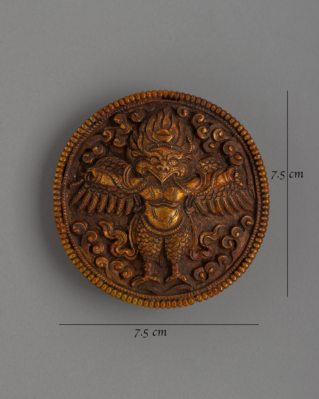 Embrace the Garuda's might and protection with our Belt Buckle. This gorgeous handcrafted piece, created of durable copper with a stunning gold-plated finish, features the majestic Garuda, a symbol of courage, wisdom, and protection in Tibetan and Buddhist traditions. This belt buckle, which measures 7.5cm in height and width and weighs 0.058kg, is both a strong fashion statement and a meaningful accessory with spiritual value.