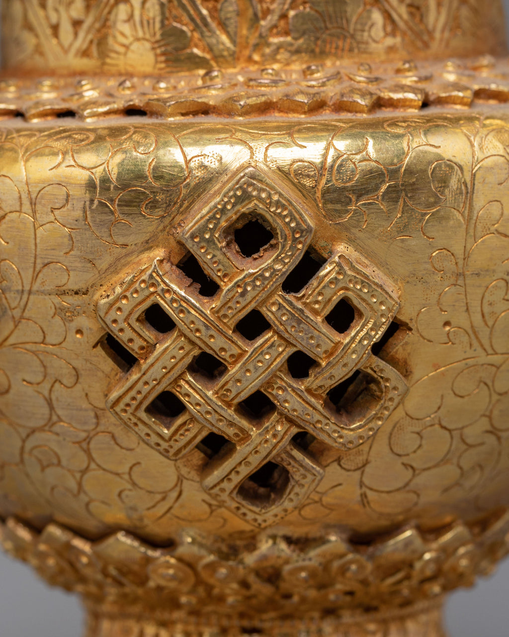 The design of the incense burner showcases traditional motifs inspired by Tibetan and Hindu cultures. The two decorative handles on either side are gracefully shaped, adding a sense of balance and harmony to the piece. The detailed filigree work around the burner, as well as the lattice design, ensures that this burner isn't just a ritual object but a beautiful art piece. The gold plating reflects the light, creating a warm glow that complements any altar, meditation space, or home decor.