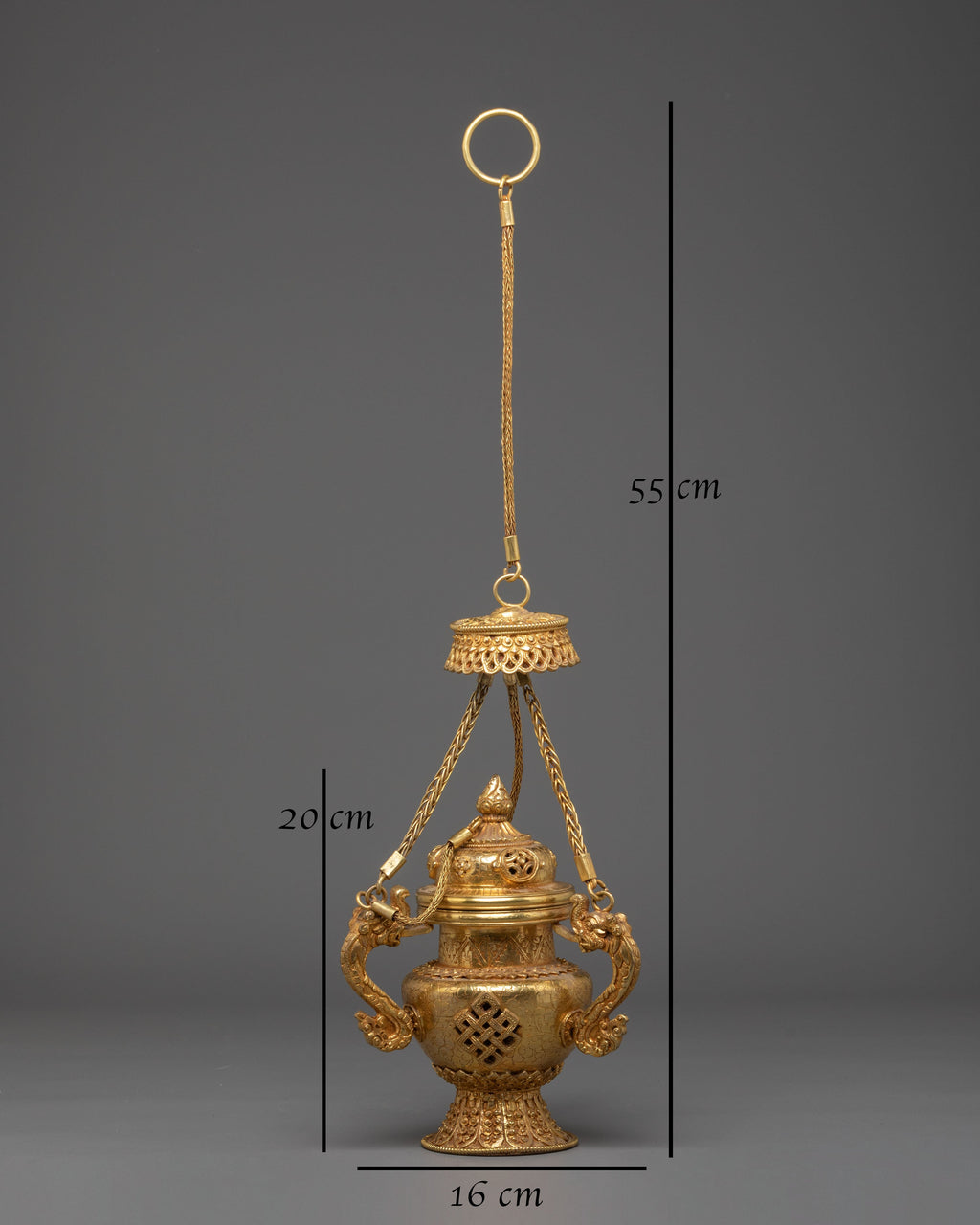 Perfect for use in rituals, prayers, or as a decorative element, this gold-plated incense burner brings an air of spirituality and tranquility to your surroundings. Whether placed in a Buddhist temple, meditation room, or sacred space, this piece will enhance your spiritual practice and create a calming atmosphere with every use. It is an excellent addition for those looking to integrate meaningful rituals into their daily lives while elevating the aesthetic appeal of their home or sanctuary.