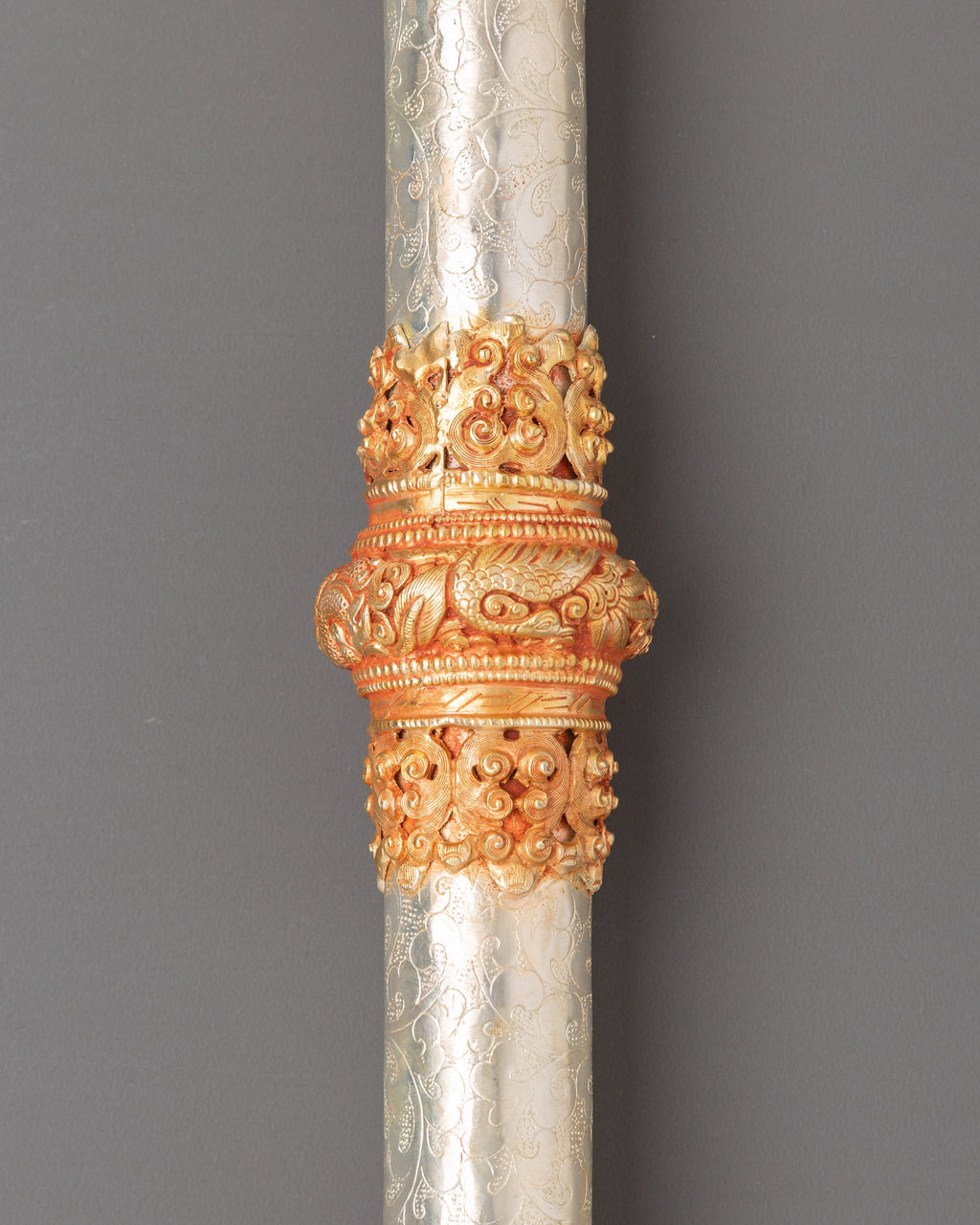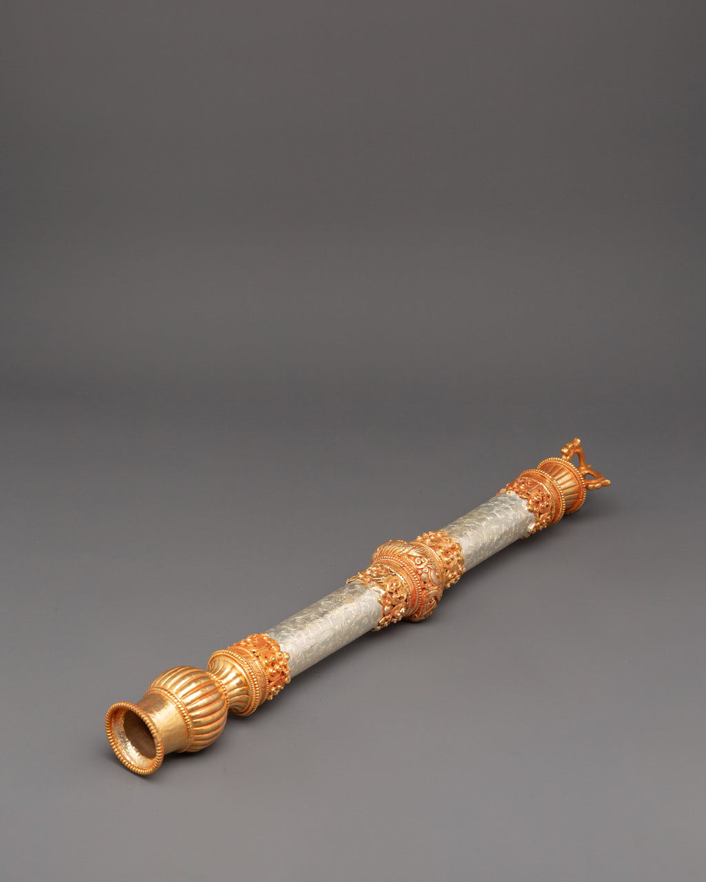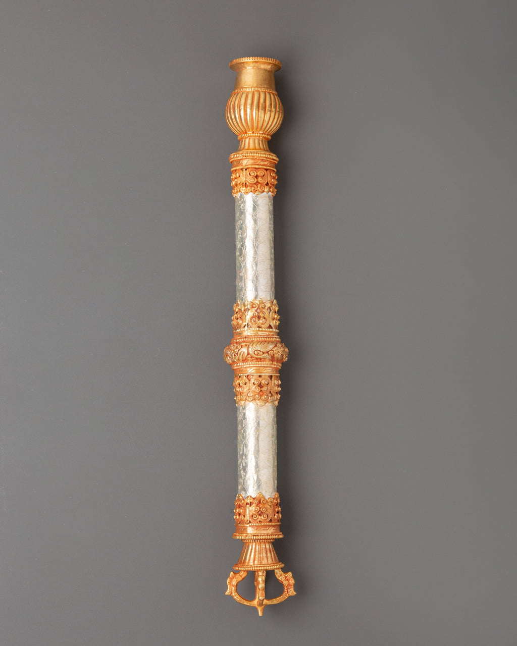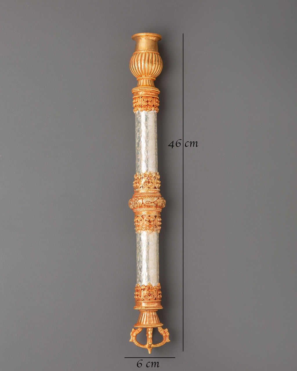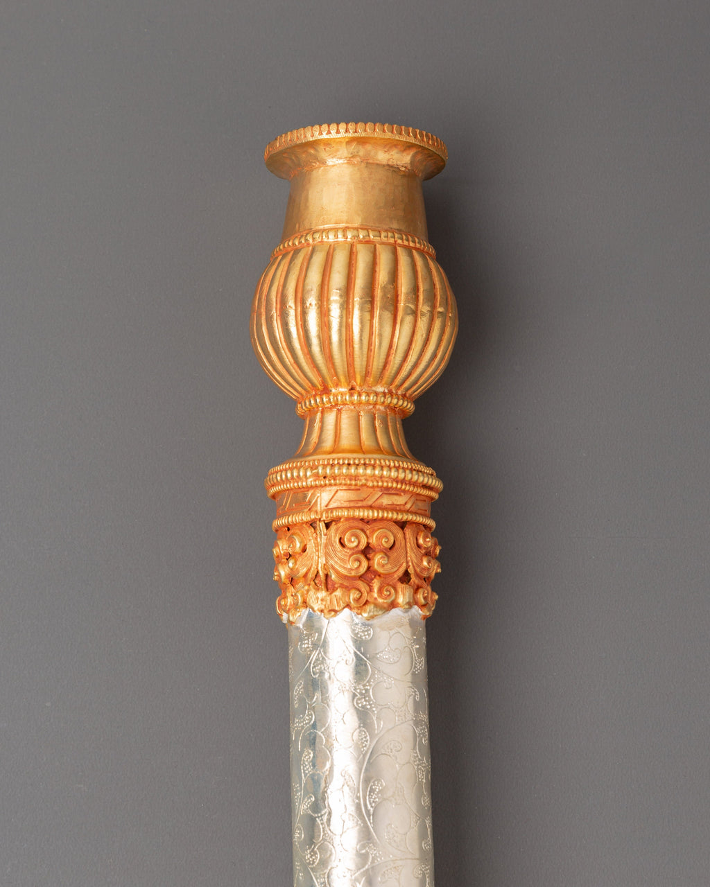 This gold-plated incense Holder for spiritual practice is a beautifully created ritual object that will enrich your meditation, offerings, and Buddhist ceremonies. This magnificent incense container, 46cm tall and 6cm wide, is constructed of copper and plated with gold and silver, combining religious meaning with cultured artistry. In Tibetan Buddhist rites, incense holders represent purification and the offering of fragrant prayers to enlightened beings.