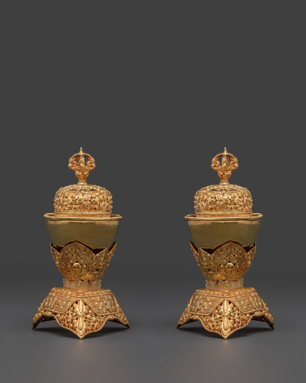 The Kapala set holds the nectar used in higher esoteric rituals. It offers liberation to gods and deities, ensuring their devotion. The offerings are said to be transformed into the Wisdom Nectar, a liquid form of the deity's Enlightened Mind.