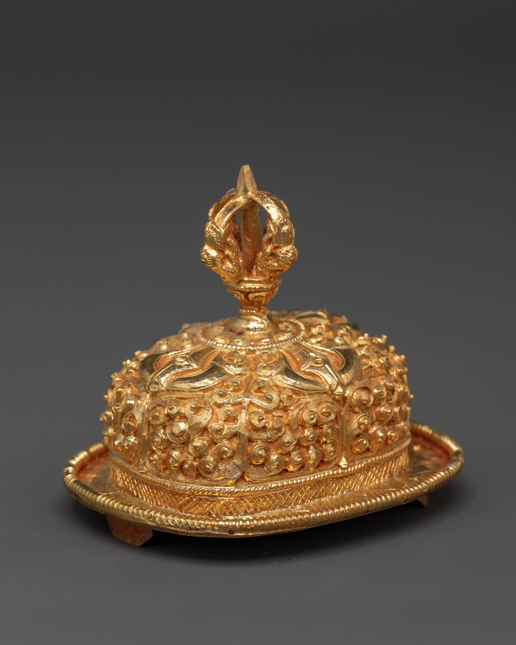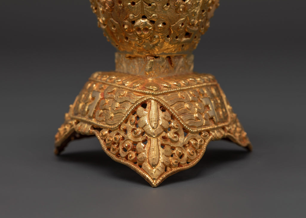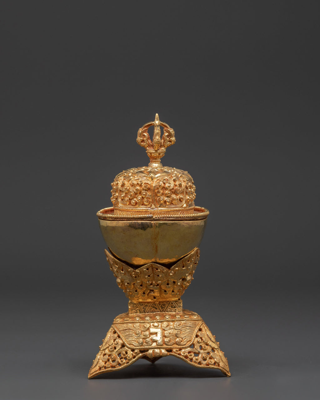 This gold-plated kapala for Buddhist ceremonies is a precious ceremonial cup with profound roots in Tibetan Buddhist practice. It is 17cm in height and 9.5cm in width and is designed as a symbolic skull cup, which is usually used in Tantric sacrifices. The Kapala is very spiritually significant, representing the turning of negative forces into enlightened insight and the gift of devotion to deities during ritual ceremonies.