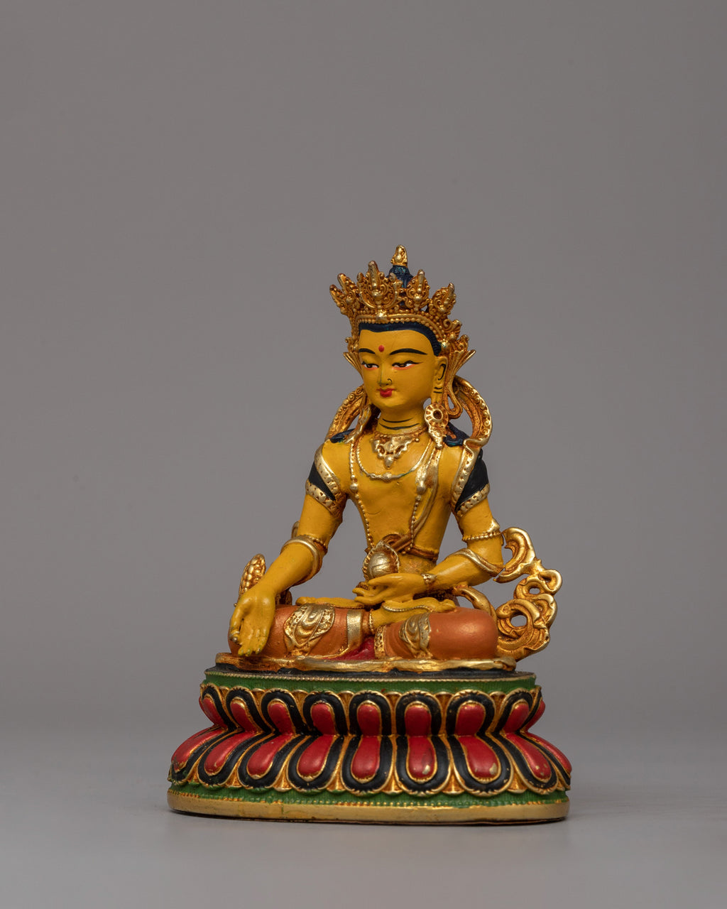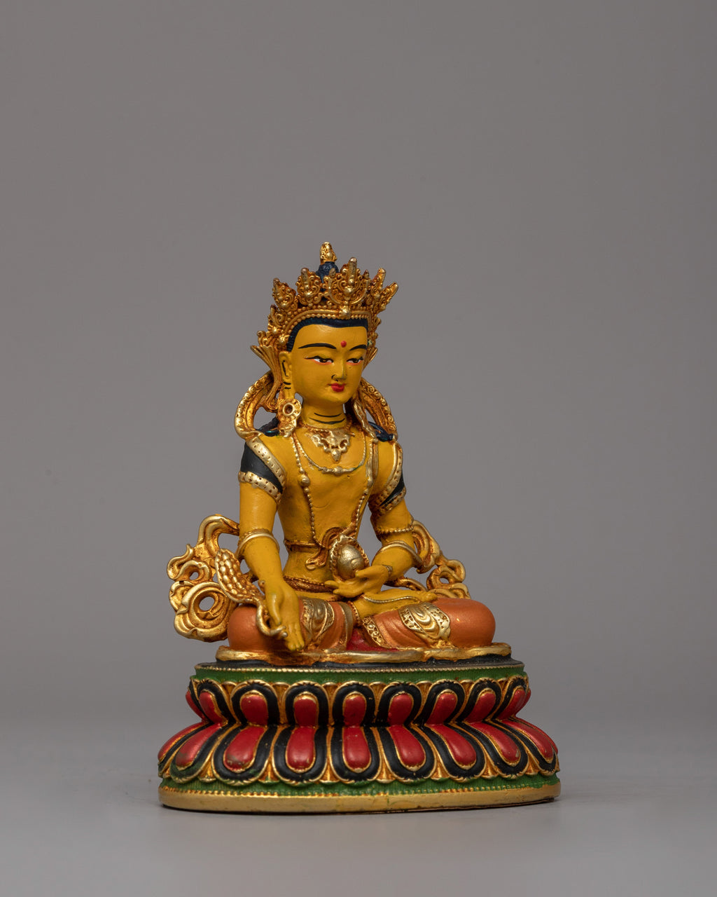 Kshitigarbha, the Earth Bodhisattva, is revered for his vast compassion and unrelenting dedication to liberating all beings from suffering. This gold-plated Kshitigarbha statue is shown in a meditative seated position, representing his profound contemplation and boundless patience. His right hand holds a wish-fulfilling jewel, representing the light of wisdom and the ability to bestow blessings, while his left hand rests on his lap, symbolizing his unwavering commitment to guide beings through the cycle of existence.