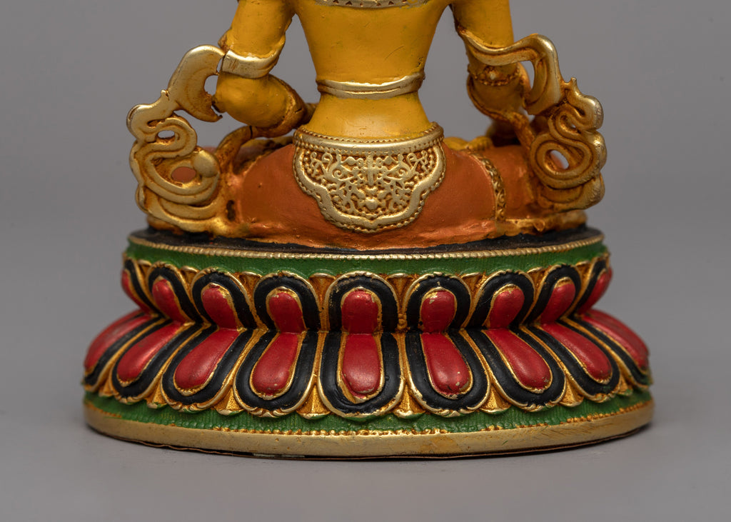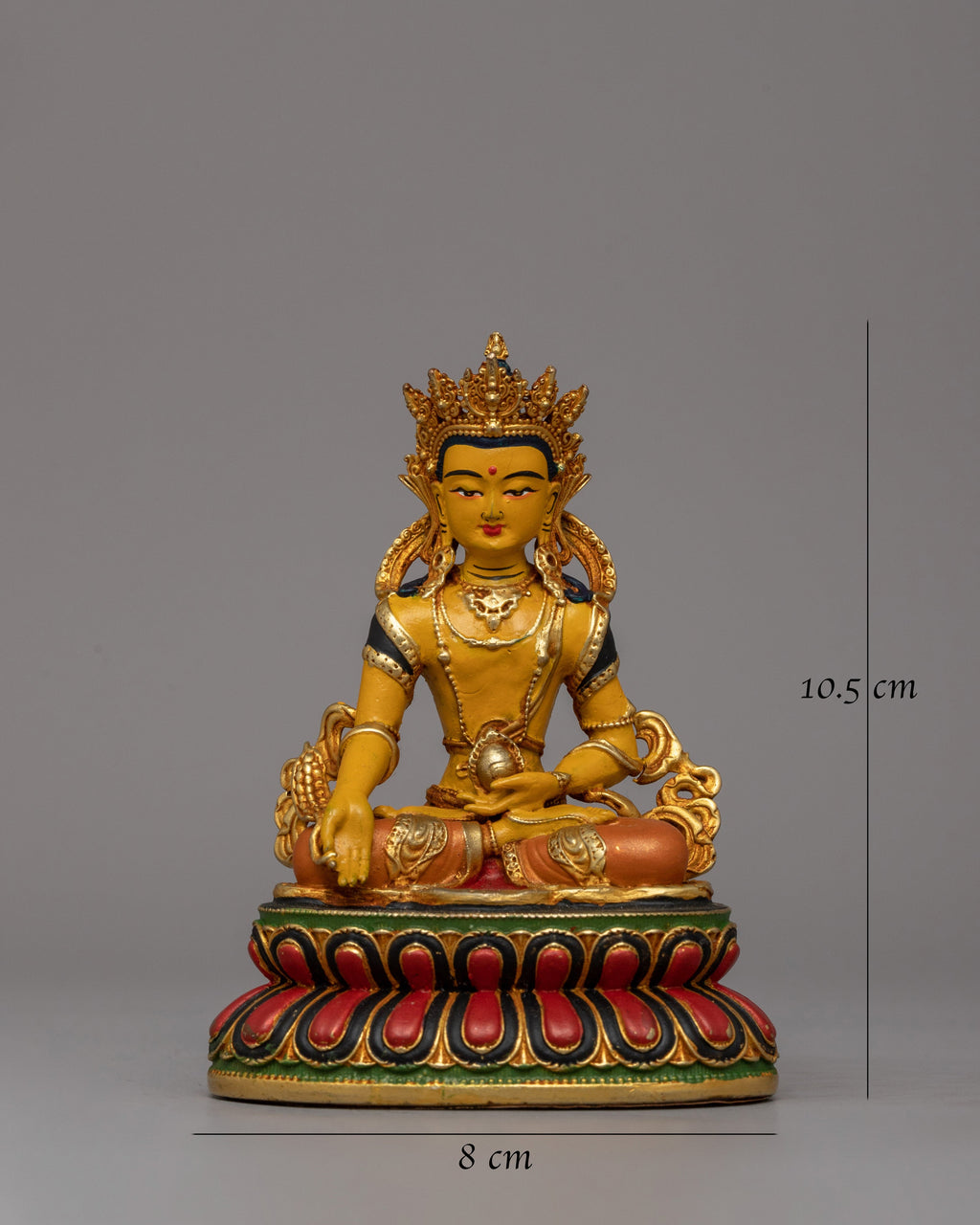 Our Gold-Plated Kshitigarbha Statue, 10.5 cm tall and 8 cm wide, is a wonderfully sculpted Buddhist bodhisattva figurine expertly created from copper, gently gold-plated, and completed with acrylic painting. This beautiful Buddhist sculpture weighs 0.21 kg and is perfect for meditation altars, prayer rooms, or spiritual home decor. The gold plating represents purity, knowledge, and divine illumination, while the copper body boosts the statue's spiritual force, resulting in a strong portrayal of Kshitigarbha's commitment to protect and guide all sentient beings.