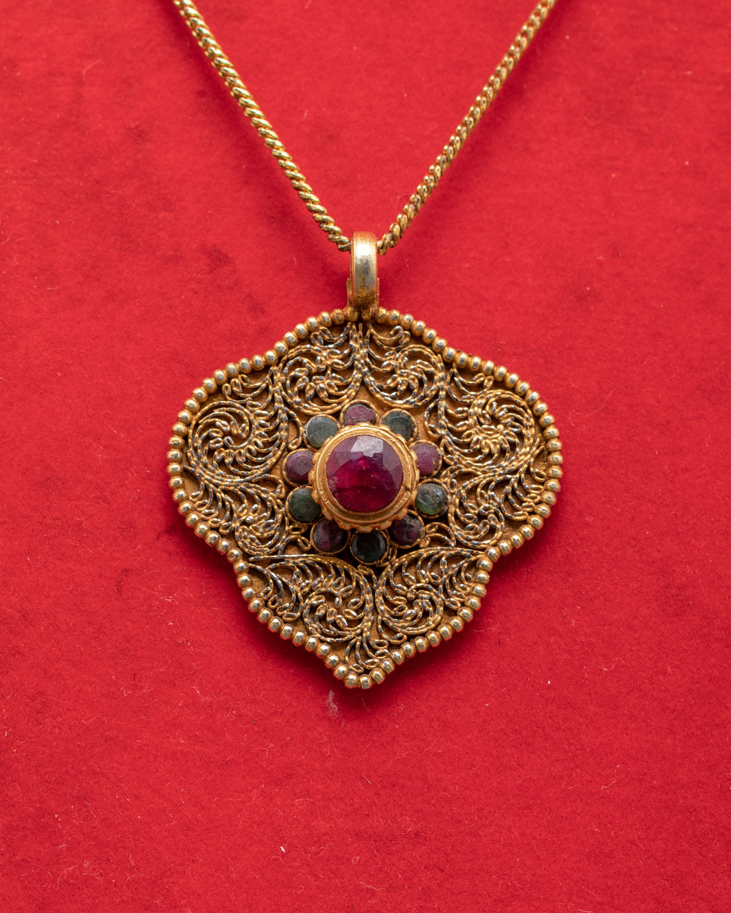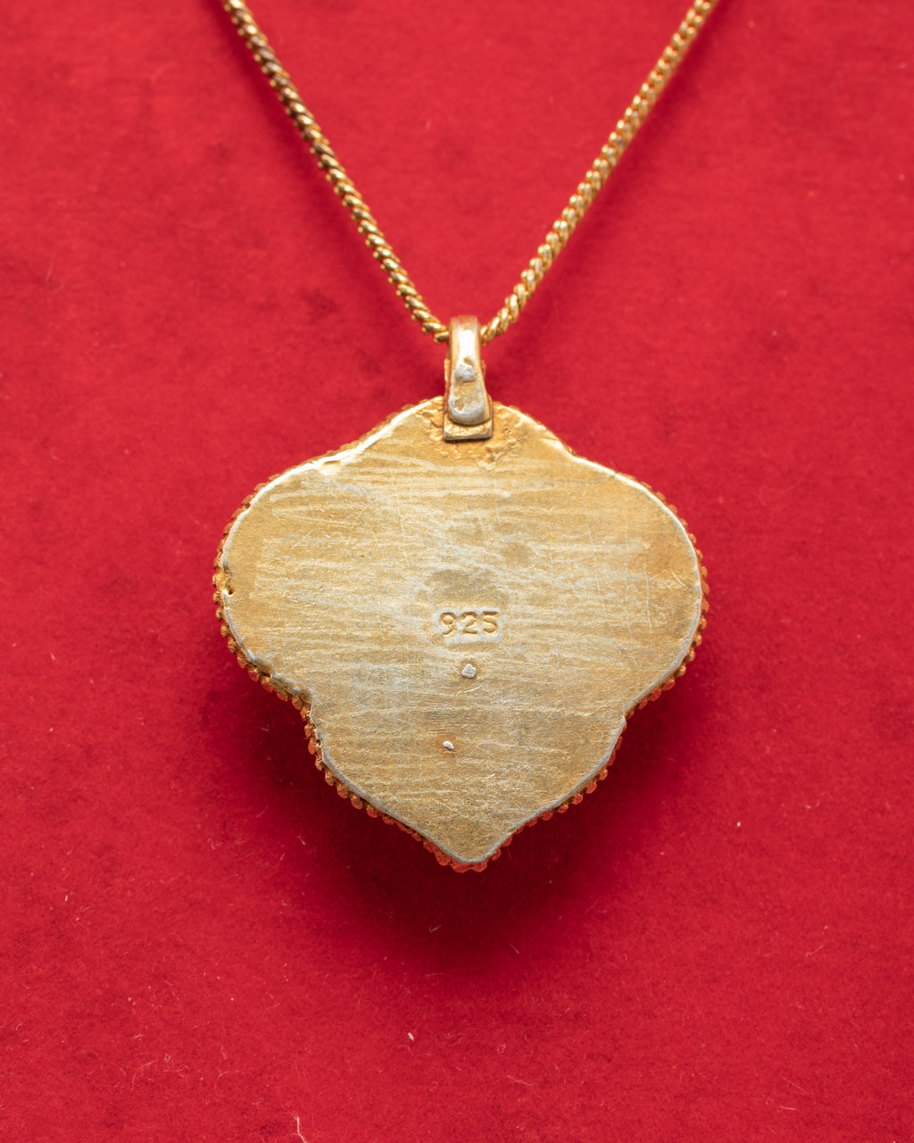 This gold-plated leaf Locket is a beautifully crafted piece of jewelry, made from silver and plated with gold. Adorned with vibrant ruby and panna (artificial stone), this pendant combines natural beauty with spiritual significance. The leaf design symbolizes growth, renewal, and harmony with nature, making it an ideal accessory for anyone seeking a blend of elegance and meaning.