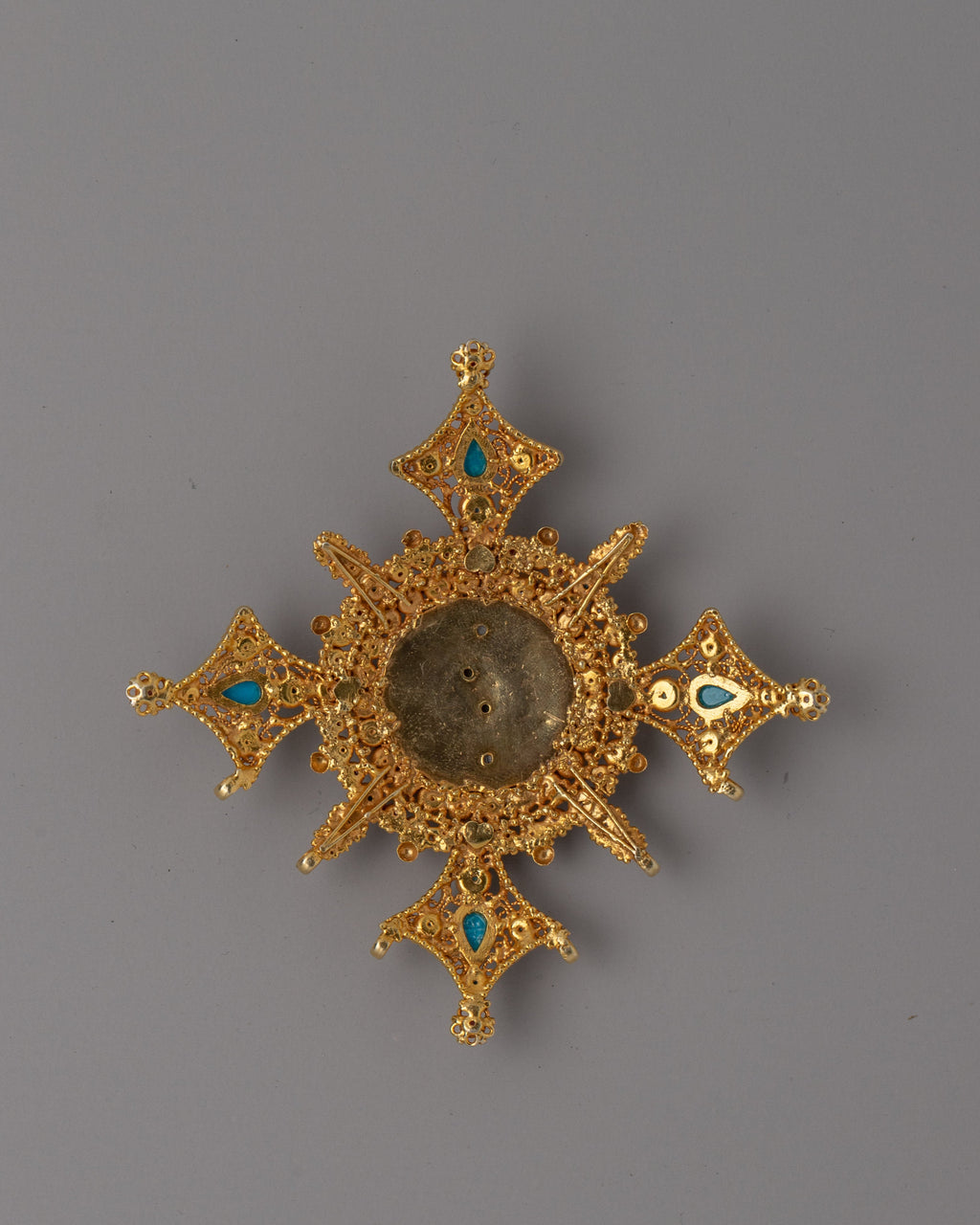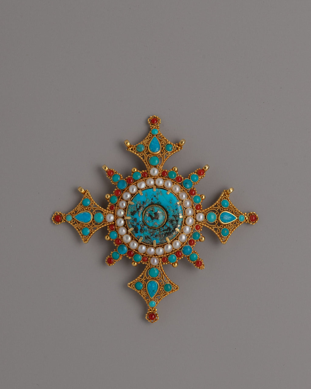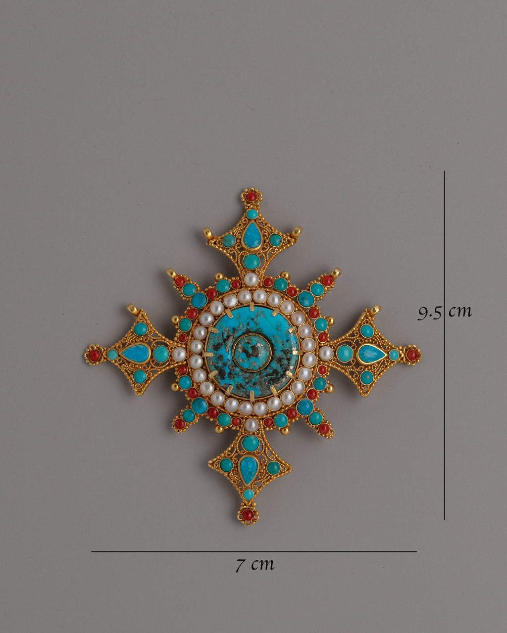 Enhance your jewelry collection with this gorgeous gold-plated copper pendant, which combines elegance, spirituality, and craftsmanship. This pendant, handcrafted from authentic turquoise, coral, and pearl stones, displays ageless charm and cultural value. Its elaborate design makes it not just a statement item, but also a profound expression of personal identity and style.