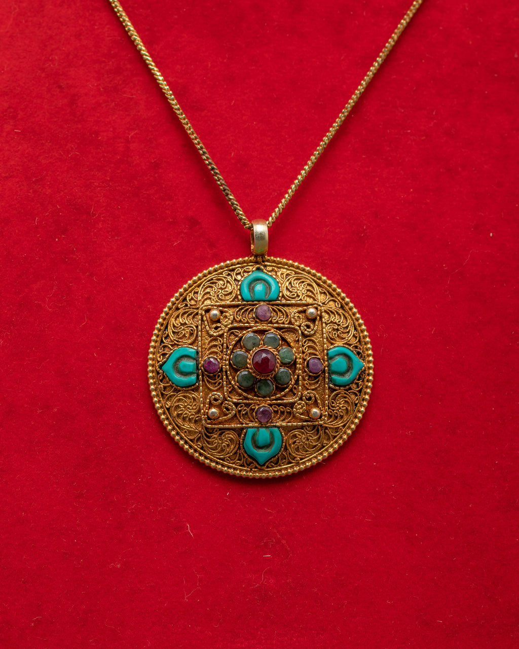Tibetan Gold Plated Pendant with Panna with Panna, Turquoise, Pearl & Ruby