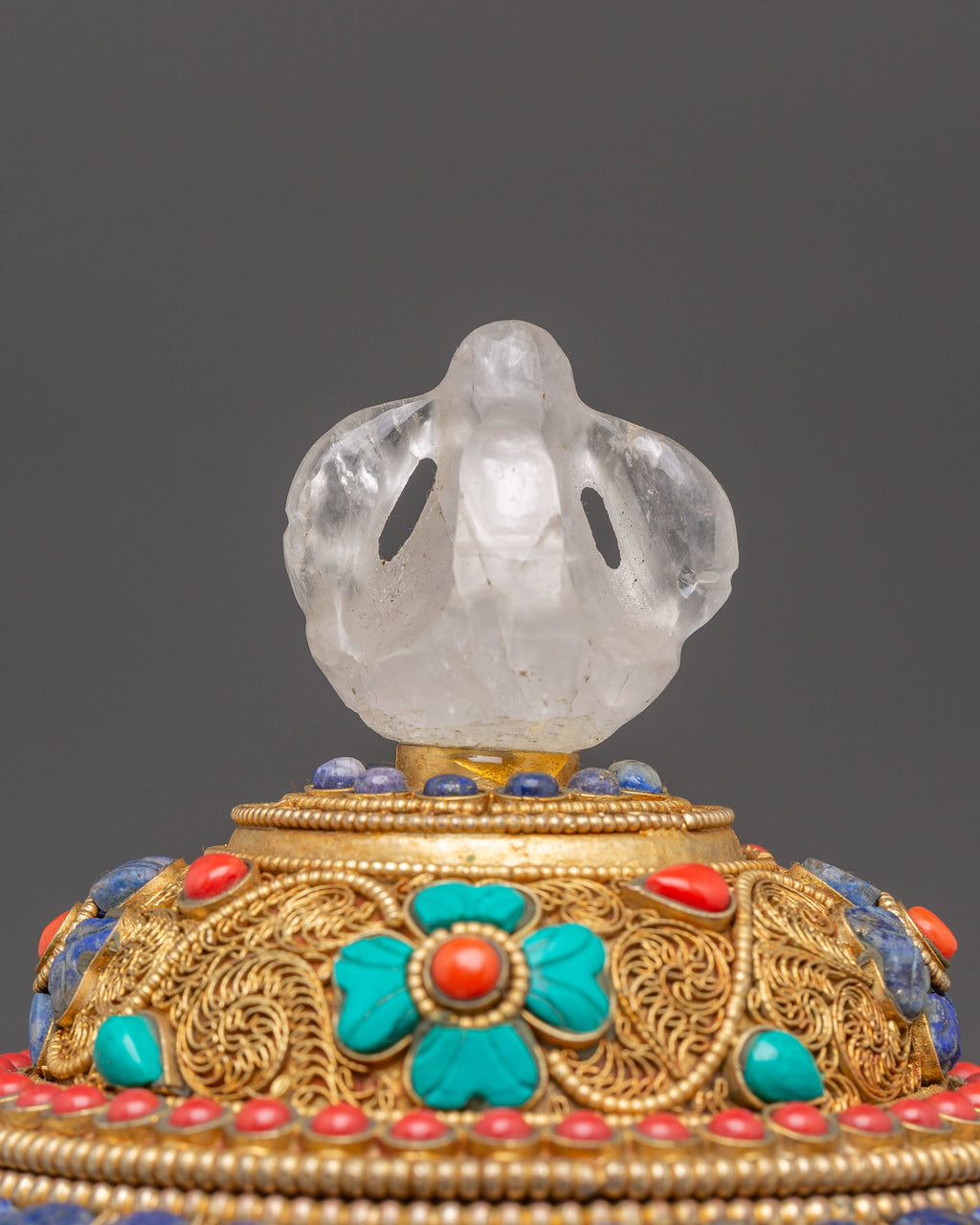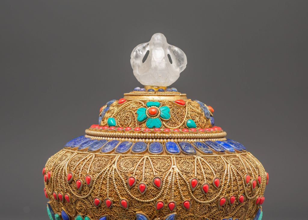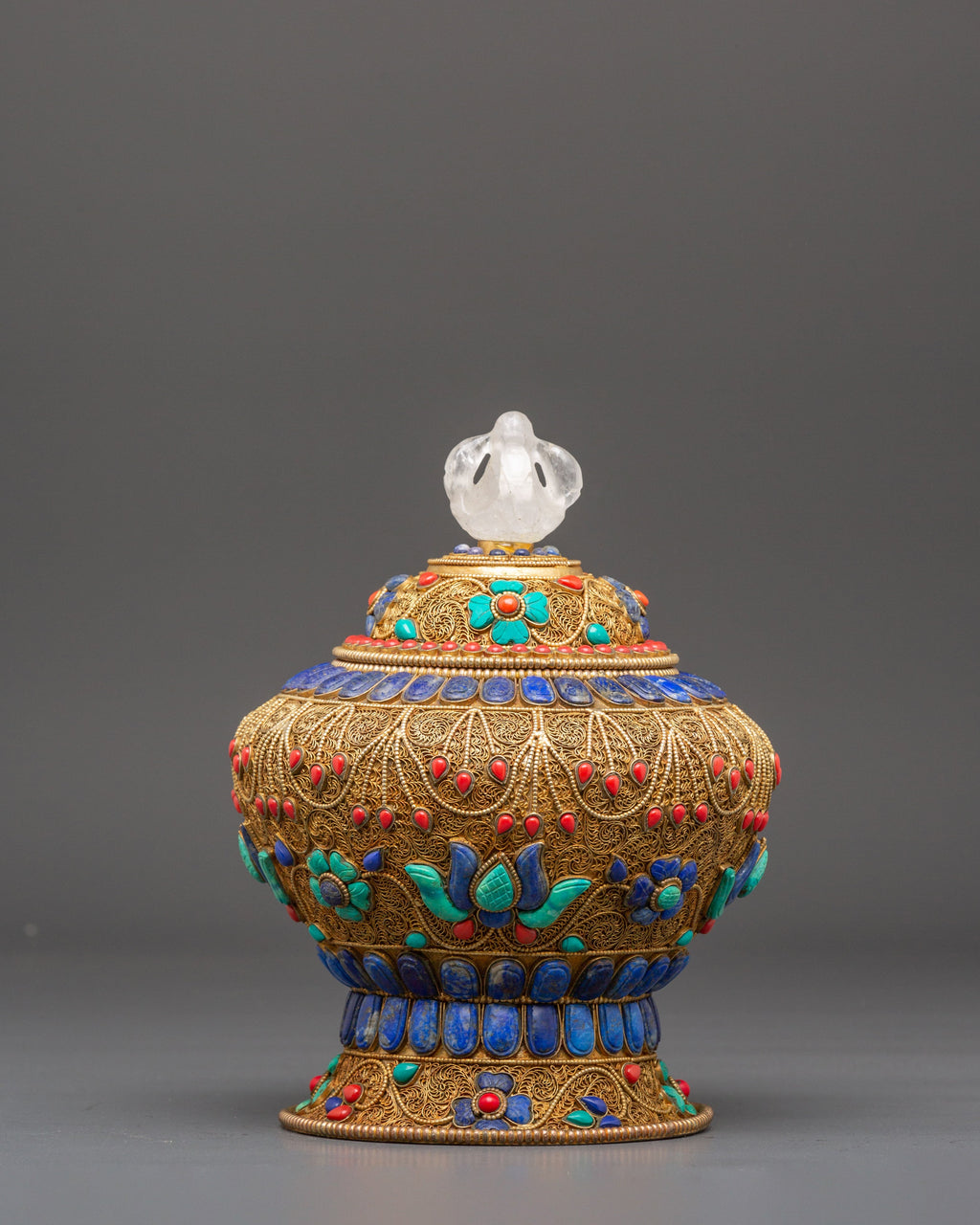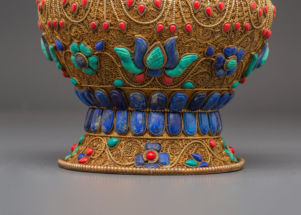 The design of this Gold-Plated Rice Pot features detailed filigree work, showcasing expert craftsmanship that highlights the piece's cultural richness. Its rounded shape and engraved details make it not just a functional item but a work of art. The multi-colored stones around the rim represent the harmony of the elements and are traditionally used in Buddhist practices for their healing properties. Ideal for use during rituals or as a decorative accent, it symbolizes abundance and nourishment, offering both physical and spiritual enrichment.