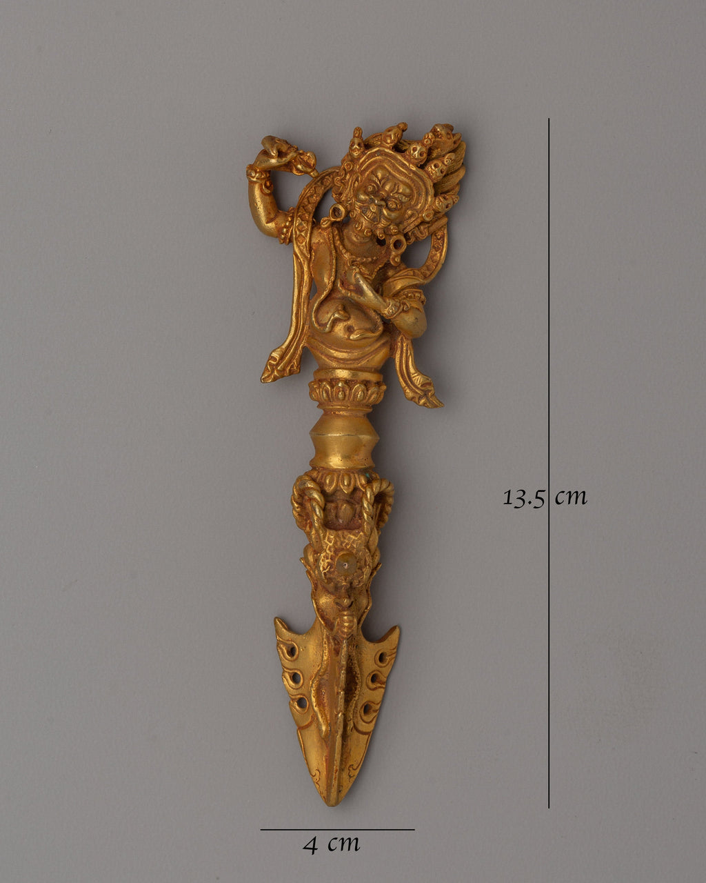 This handcrafted, gold-plated Phurba dagger helps you experience Tibetan rituals' spiritual power. This lightweight spiritual tool, which measures 13.5 cm in height by 4 cm in breadth and weighs only 0.13 kg, is composed of a copper body that has been elegantly electro-plated. In Buddhist rituals, the Phurba, also known as the Vajrakila, is a symbolic dagger used to eliminate negative energy and change it into positive spiritual force.