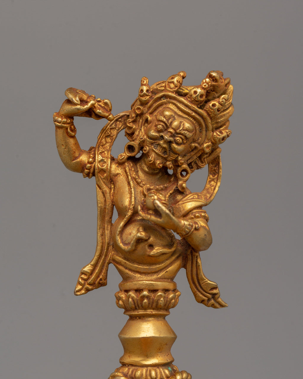 This Phurba is intricately crafted with ancient designs that symbolize the harmony of mind, body, and spirit with its three-sided blade and intricate handle. Its stunning appearance and spiritual value are enhanced by the gold-plated finish, which makes it a necessary addition to any altar or entrance of worship. This Phurba showcases the elegance and spiritual value of Himalayan traditions, whether it is used for meditation, ritual purposes, or collecting. For those who practice spirituality and appreciate sacred art, it also makes a thoughtful present.