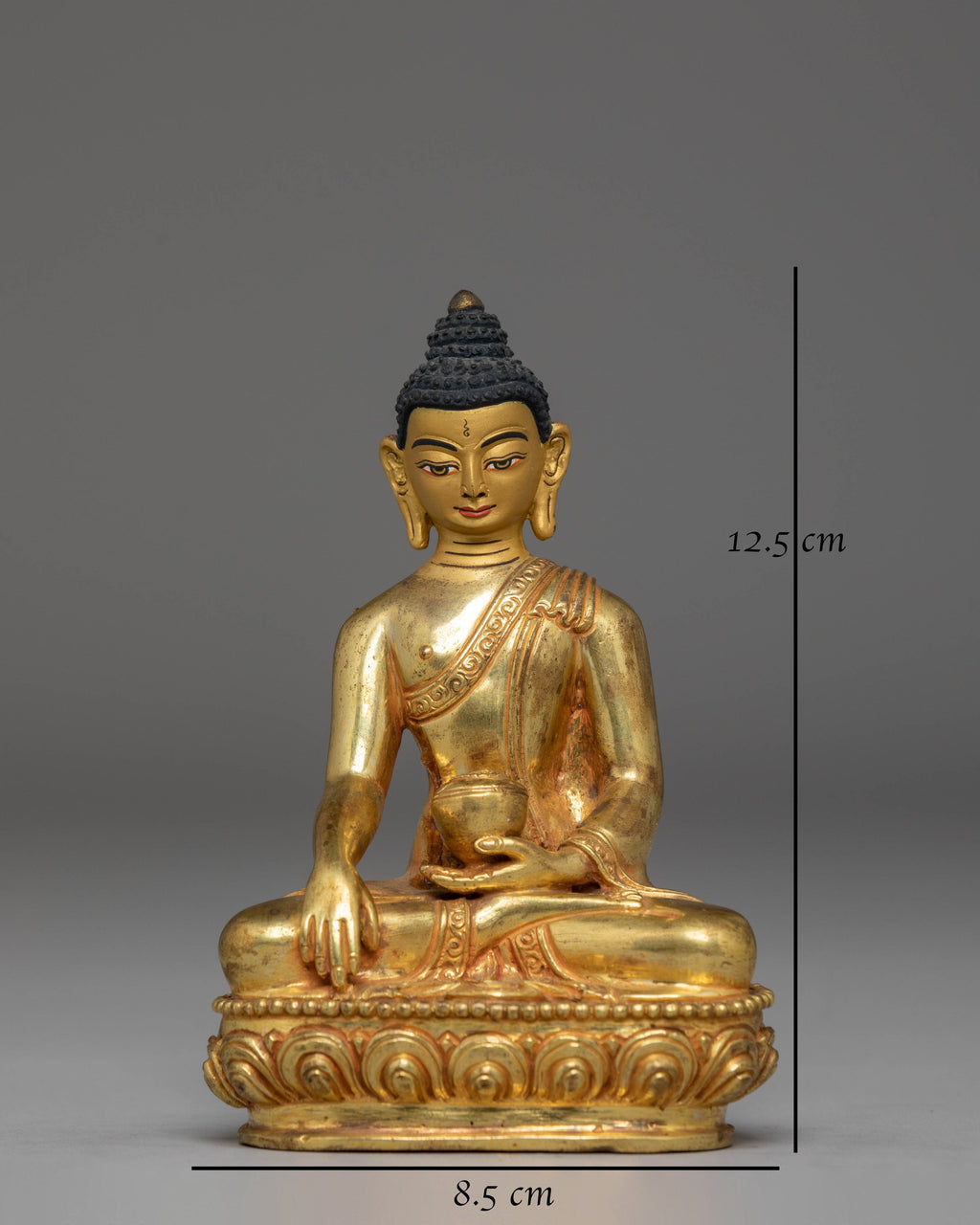 This Gold Plated Statue of Shakyamuni Buddha is a beautifully handcrafted devotional piece designed to enrich your altar, meditation room, or spiritual home decor. Measuring 12.5cm in height and 8.5cm in width, and weighing 0.46kg, it offers an impressive and balanced presence despite its compact size. Crafted from a copper body and adorned with gold plating, this statue radiates a warm, serene glow—perfect for anyone seeking Buddhist art infused with spiritual symbolism.