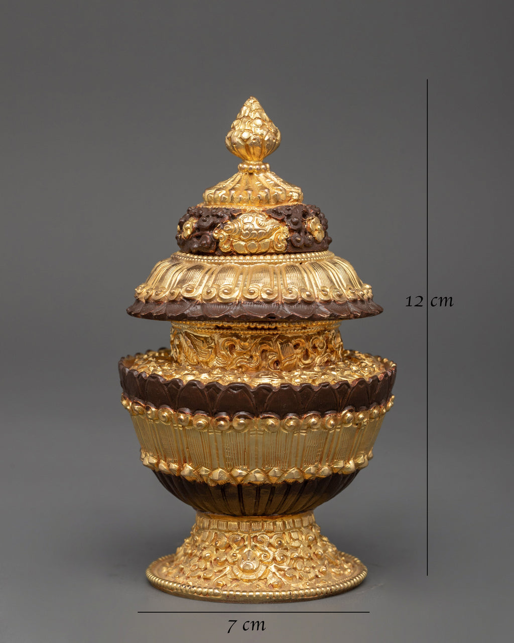 The Authentic Tibetan Copper Rice Pot is a handcrafted ritual item. Designed for offerings and spiritual rituals, this copper pot, which is gold-plated and is 12cm in height and 7cm in width, represents purity and devotion. Its graceful design embodies the wealth of customs associated with Buddhist and Tibetan practices, having been crafted with great care by expert artisans. Its shimmering gold-plated heightens its sacred significance, rendering it a valuable addition to any altar or temple environment.