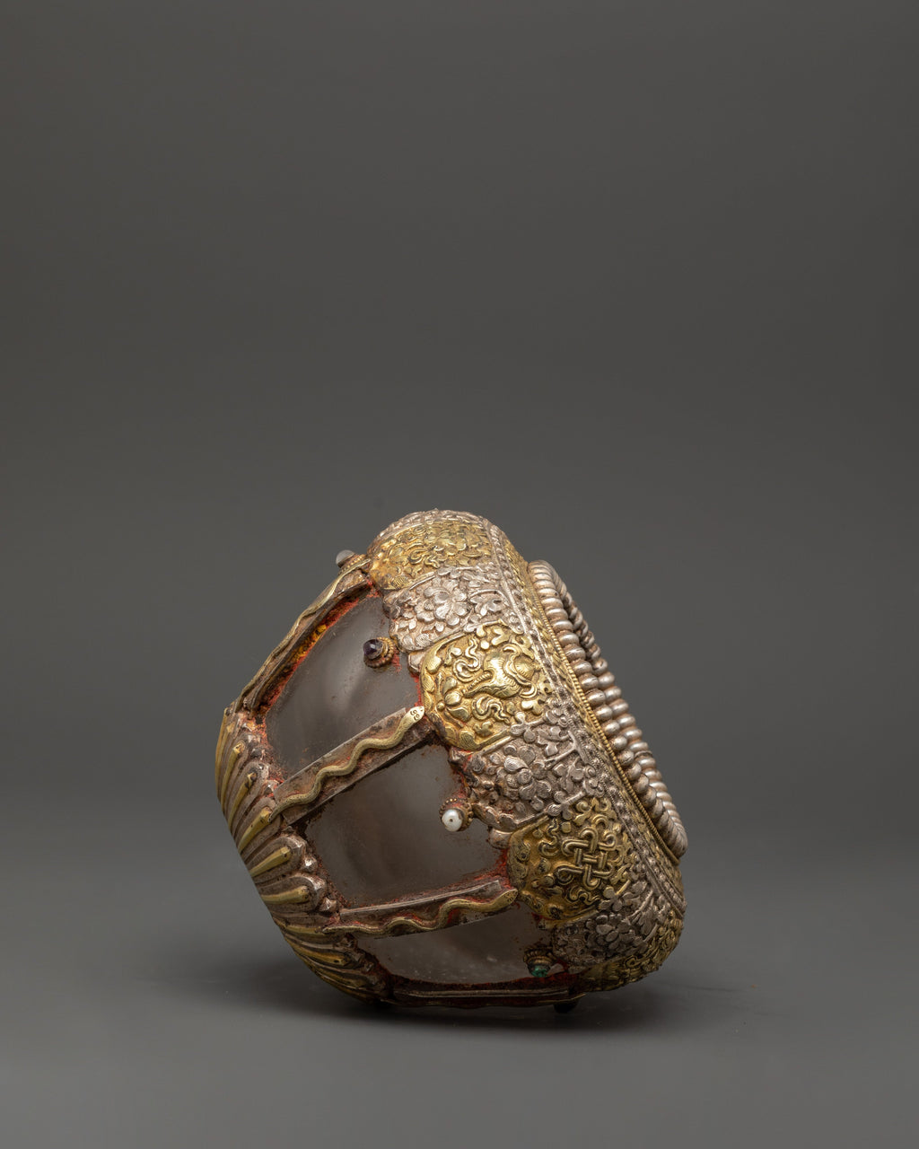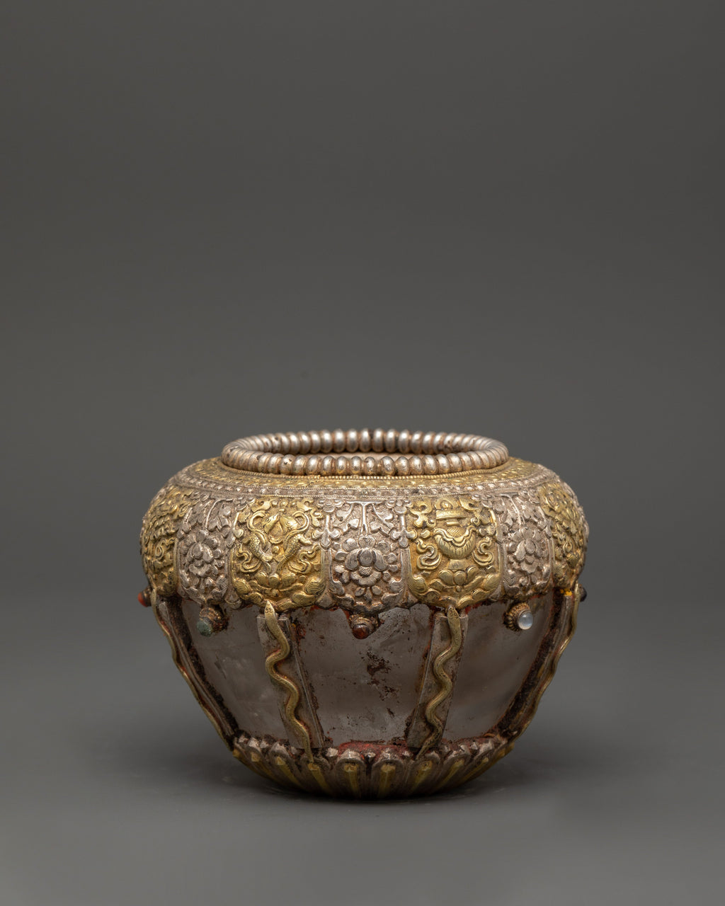 In Tibetan Buddhist traditions, this precious artifact is utilized to make ritual gifts, blessings, and devotion. The crystal, gold, and silver mix channels positive energy and spiritual protection, making it an indispensable tool for meditation, prayer, and ceremonial use. Its exquisite shape and attentive details make it an excellent addition to any altar or shrine as a symbol of devotion and a channel for spiritual blessings. The Golpa is both a utilitarian ritual item and a gorgeous work of art. It is ideal for anyone looking to improve their spiritual practices or add a meaningful piece of Tibetan heritage to their collections.