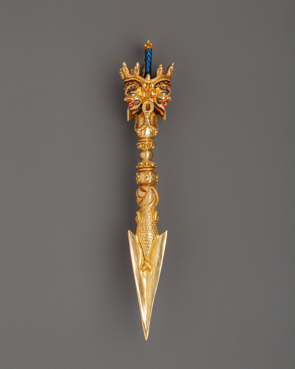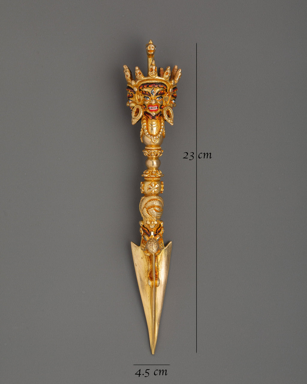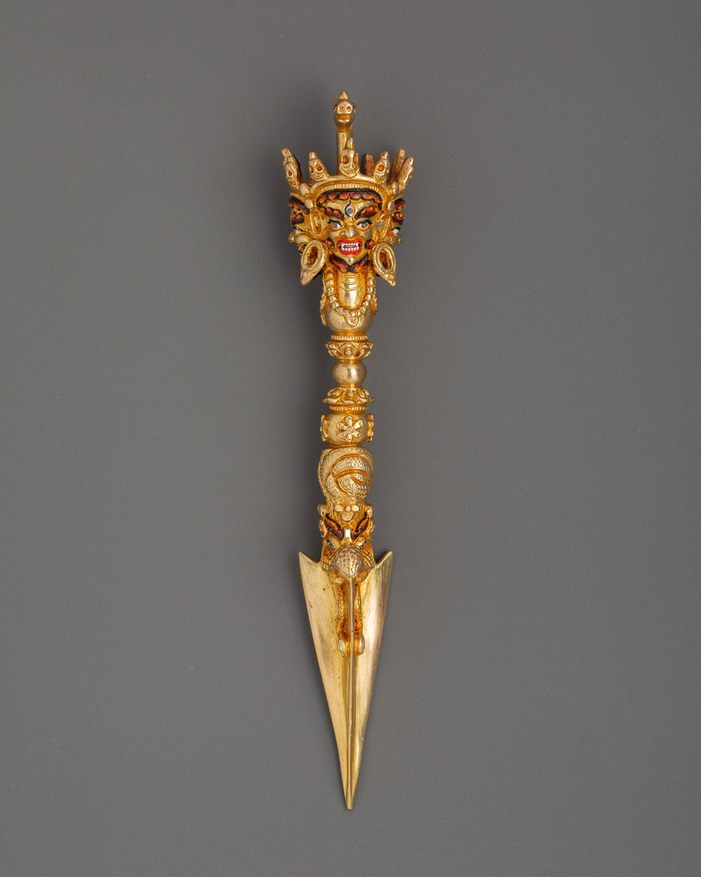 This wonderfully handcrafted Gold-Plated Tibetan Phurba Dagger allows you to receive benefits from the strong protecting power of Tibetan ritual. This 23cm sacred dagger, made of copper and plated in gold, has a carefully crafted triple-sided blade crowned with the wrathful deity face – a potent emblem of overcoming negativity, ego, and spiritual difficulties.