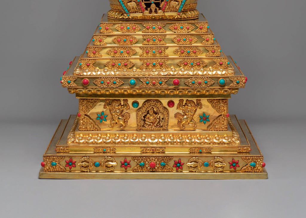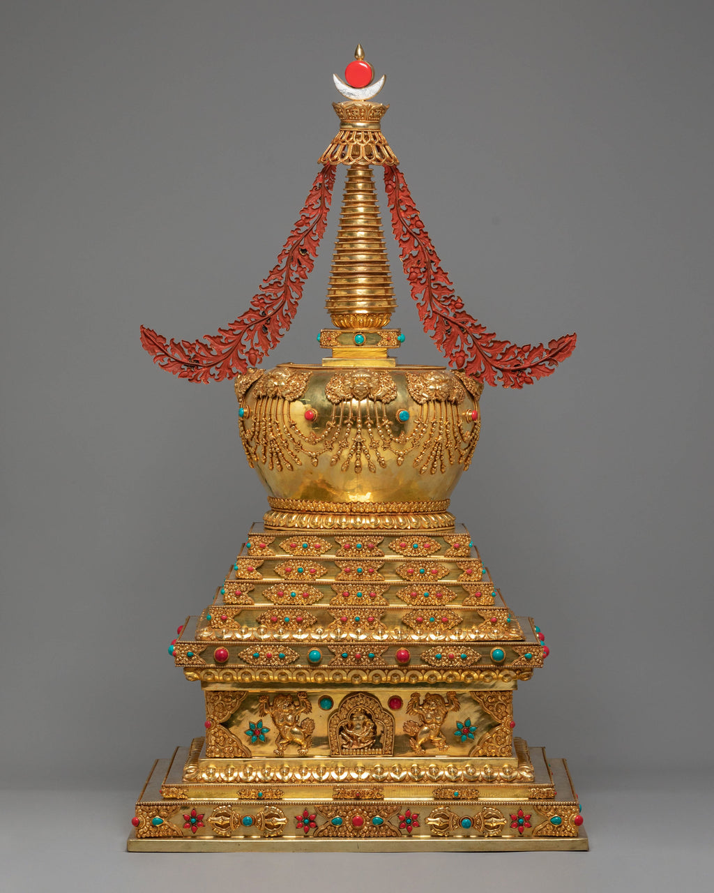 The detailed design showcases Tibetan artistry at its finest. On the lower sections of the stupa, you’ll find finely detailed depictions of deities and guardians that add sacred meaning to the structure. These artistic elements reflect the guardianship and divine protection that the stupa offers to those who seek refuge in its spiritual power. The coral and turquoise motifs are not only decorative but also serve to amplify the stupa's symbolism of purification, prosperity, and the removal of obstacles.