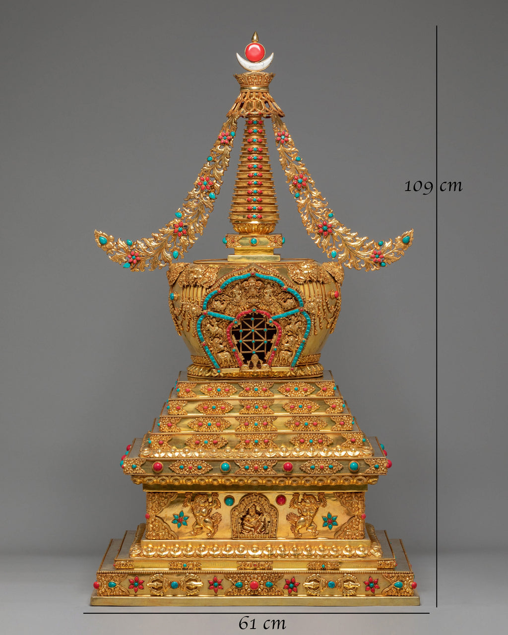 At the top of the stupa, a radiant finial with a central gemstone signifies the divine connection to the spiritual realm, symbolizing the union of heaven and earth. The overall structure of the stupa is meticulously designed to represent the interconnectedness of all things, with each layer and element contributing to its purpose: spiritual elevation and connection to higher wisdom. Perfect for any meditation space, altar, or temple, this Tibetan Sacred Stupa serves not only as a decorative piece but as a powerful spiritual tool, inviting blessings, peace, and harmony into your home or sacred space. Its rich symbolism, combined with its exquisite craftsmanship, makes it a perfect focal point for anyone seeking a deeper connection to Tibetan Buddhist traditions and teachings.