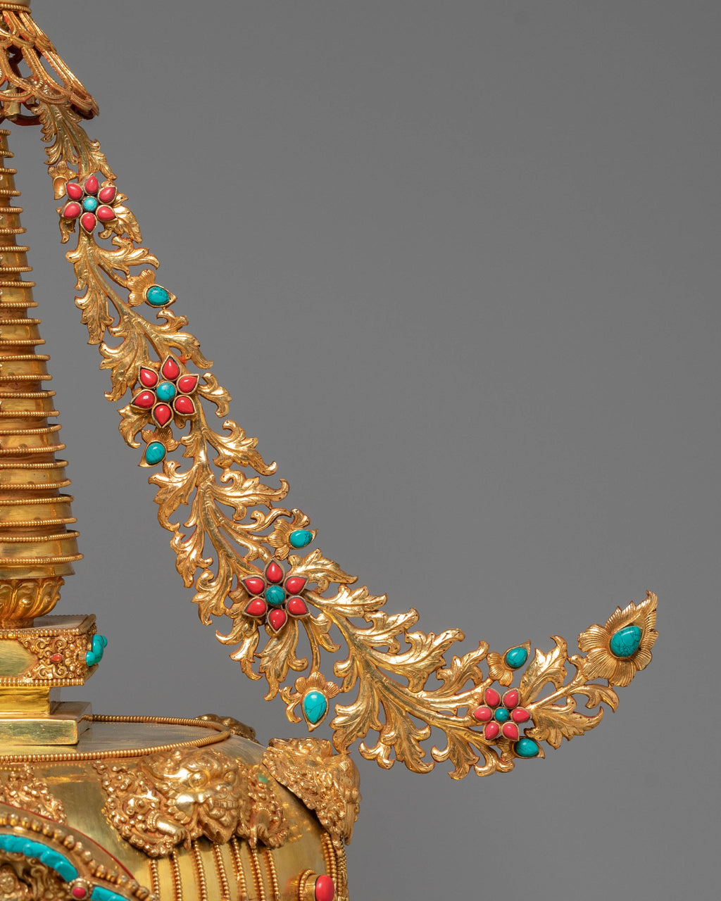 The Gold Plated Tibetan Sacred Stupa is a masterpiece of spiritual craftsmanship, designed to represent the path to enlightenment and the sacredness of Buddhist teachings. Made from a copper body and finished with electro gold plating, this stupa features intricate coral and turquoise stones that enhance its beauty and symbolic significance. The coral and turquoise stones are strategically placed, each one representing vitality, wisdom, and spiritual protection, which are integral to Tibetan Buddhist practices. The vibrant colors contrast beautifully with the gold-plated surface, creating a radiant piece that symbolizes both material and spiritual wealth.