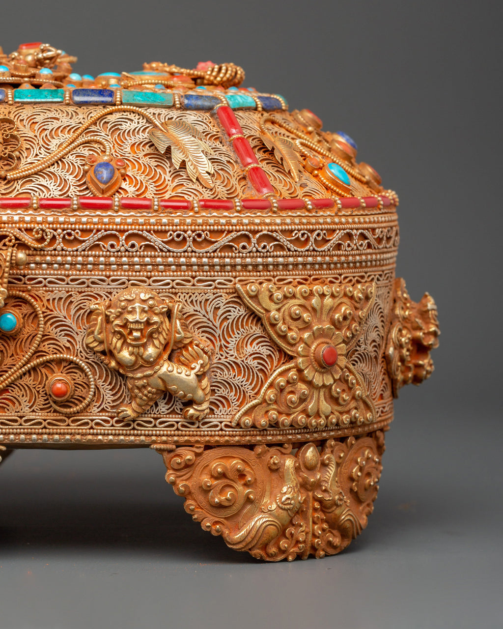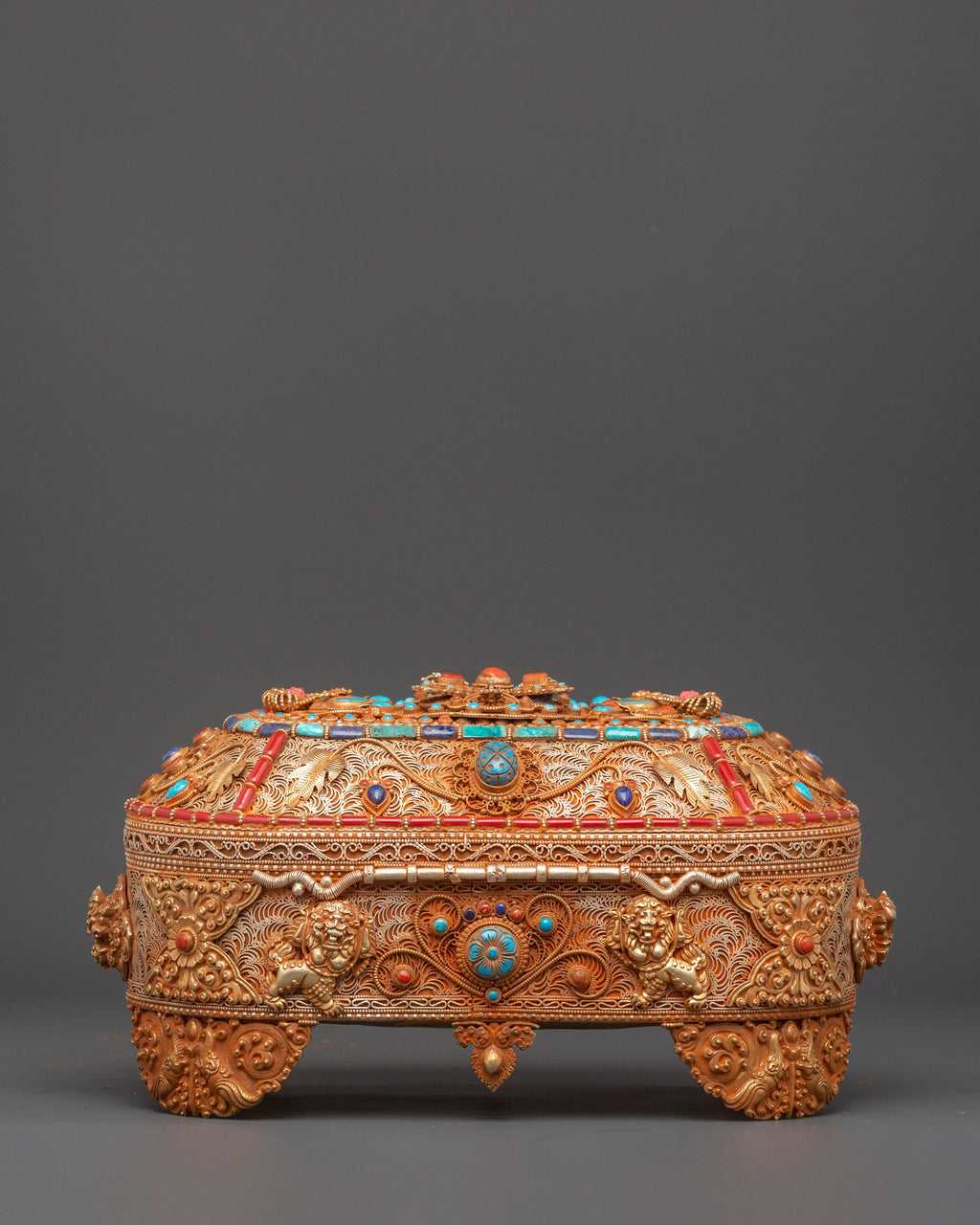 This box is made of copper and finished in gold plating. It is embellished with artificial turquoise and coral stones, which, according to Tibetan tradition, are believed to possess healing and protective energies. The entire surface is intricately decorated with filigree art, legendary animals, and floral motifs that represent heavenly protection and plenty. Whether used in personal rituals or displayed as a decorative relic, this treasure box serves as a sacred storage for jewelry, dedication, and cultural heritage.
