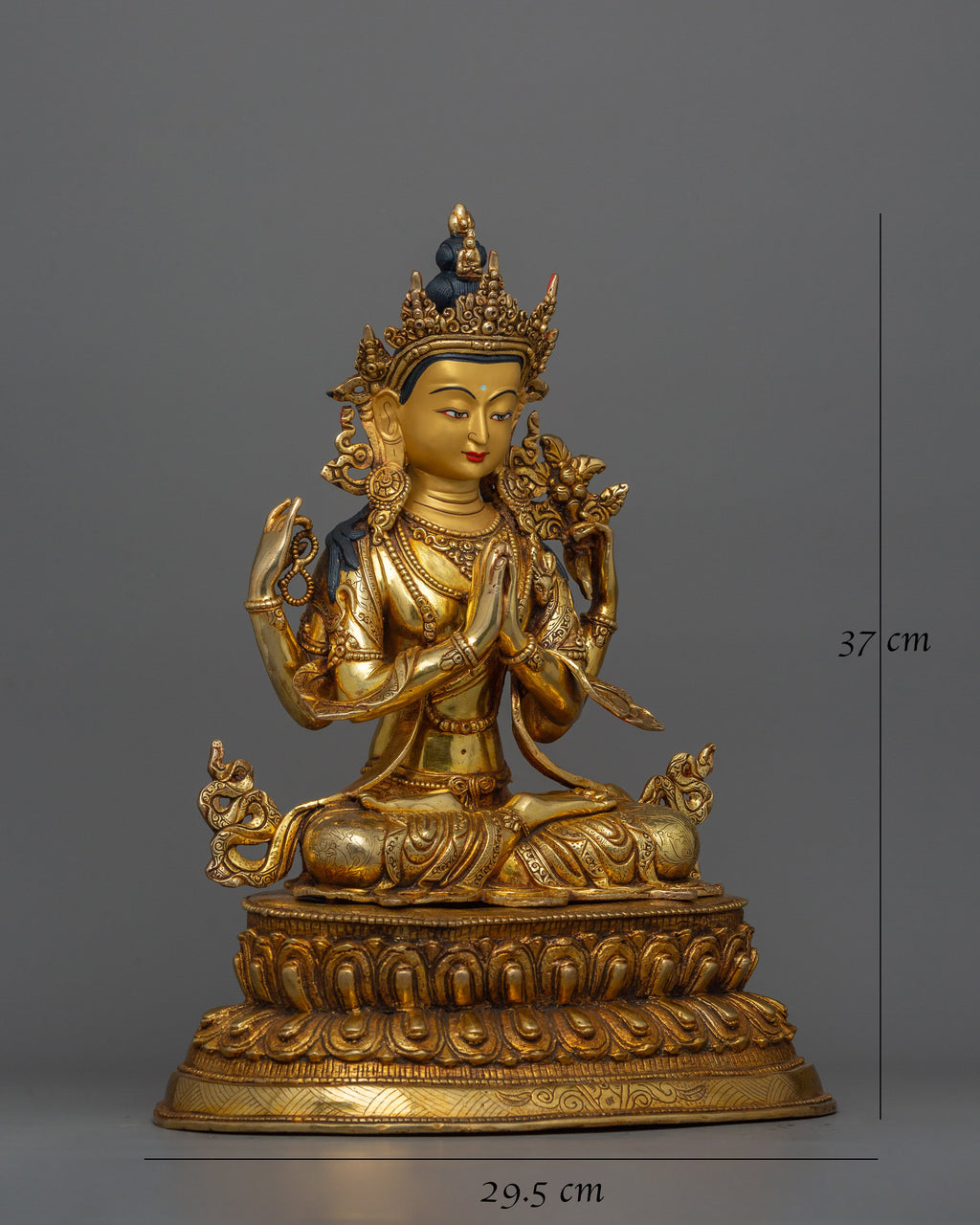This skillfully crafted Golden Avalokiteśvara Statue, gilded in 24k gold, is a stunning depiction of the Four-Armed Chenrezig. As a symbol of compassion and enlightenment, it brings a sense of serenity and spiritual connection to any space. Made with intricate attention to detail, it is a beautiful addition to any home, office, or meditation space.