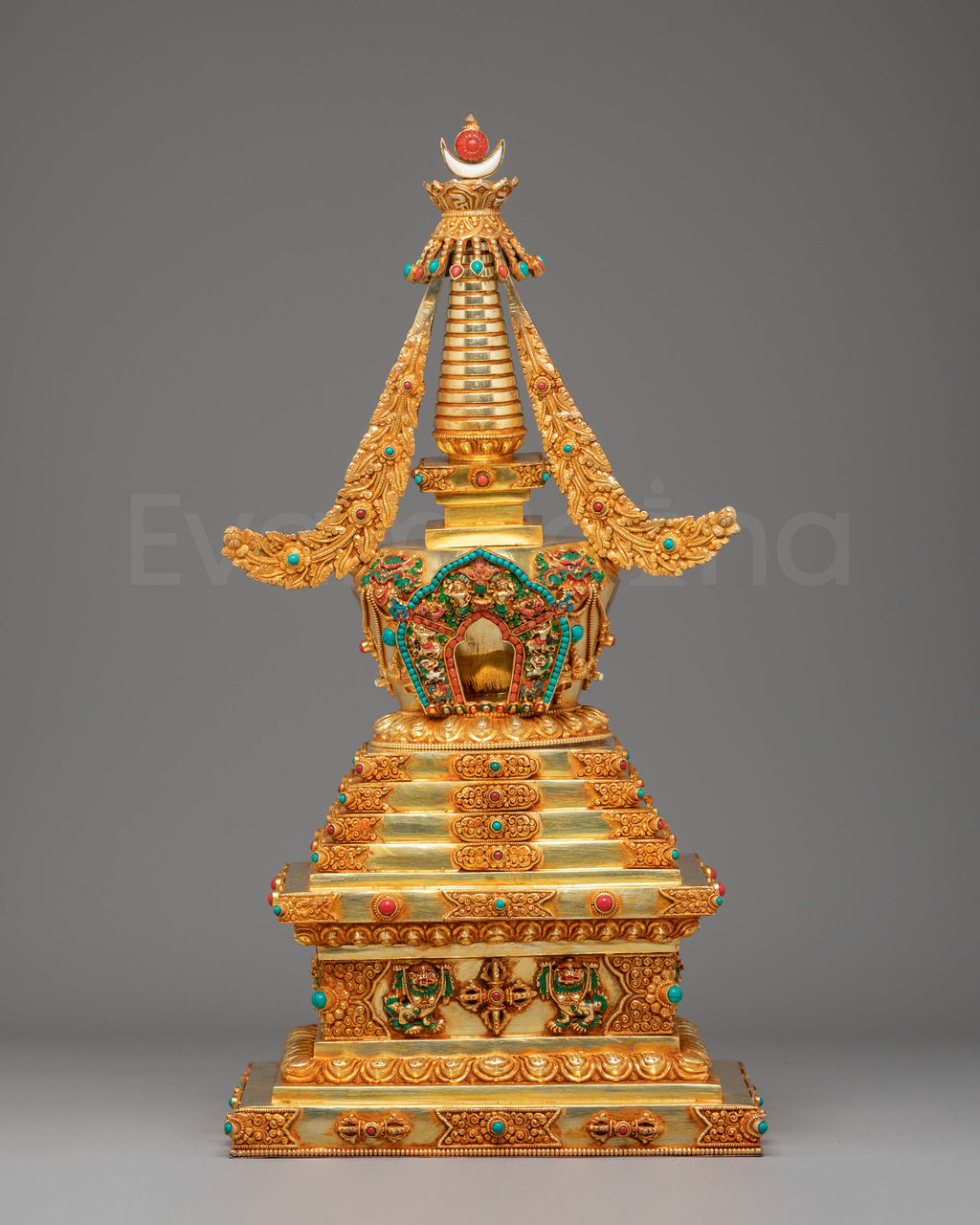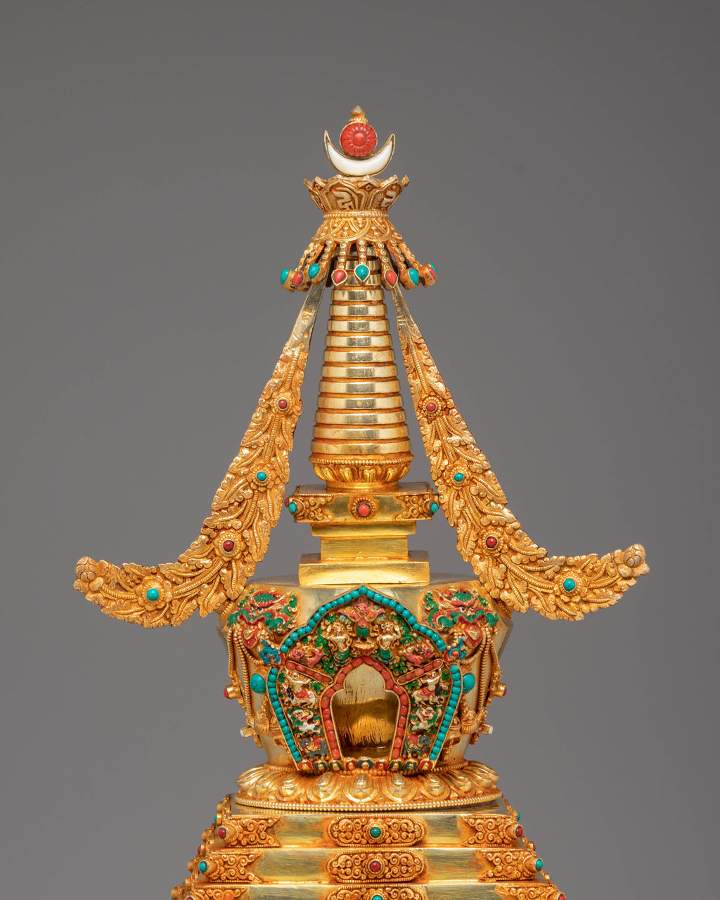 Perfect for placing on a Buddhist altar, meditation shrine, or sacred space, this Golden Stupa radiates peace, harmony, and protective blessings. Whether used for ritual offerings, as a meditation focus, or as an inspiring decor piece, it enhances spiritual practice and elevates the atmosphere with its warm, luminous presence. Its blend of gold plating, traditional copper craftsmanship, and symbolic coral and turquoise accents makes it an exceptional addition for practitioners and collectors of Tibetan Buddhist art.