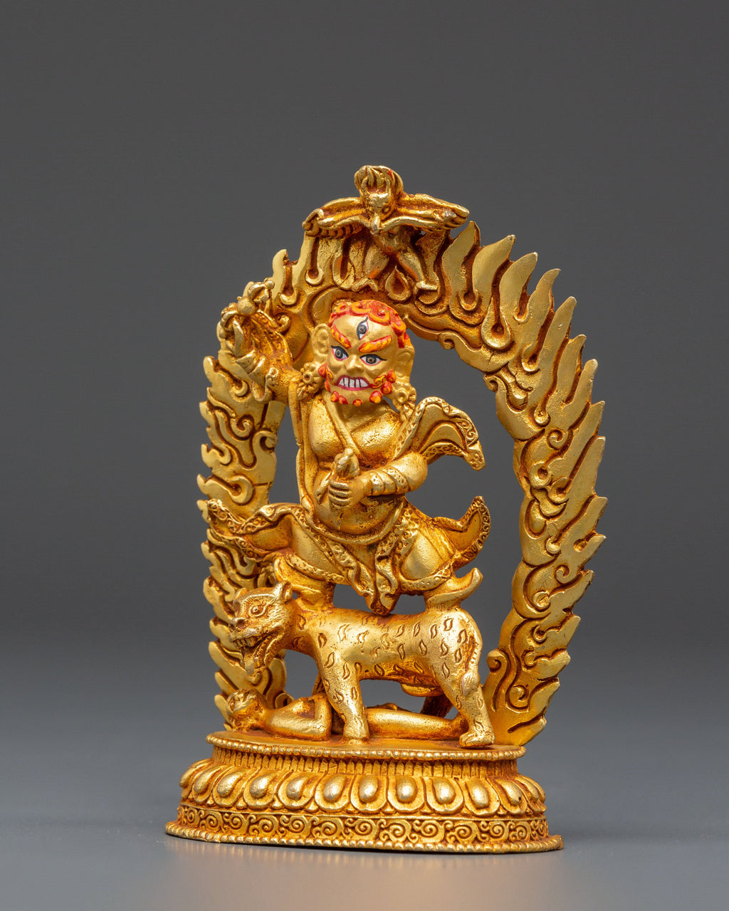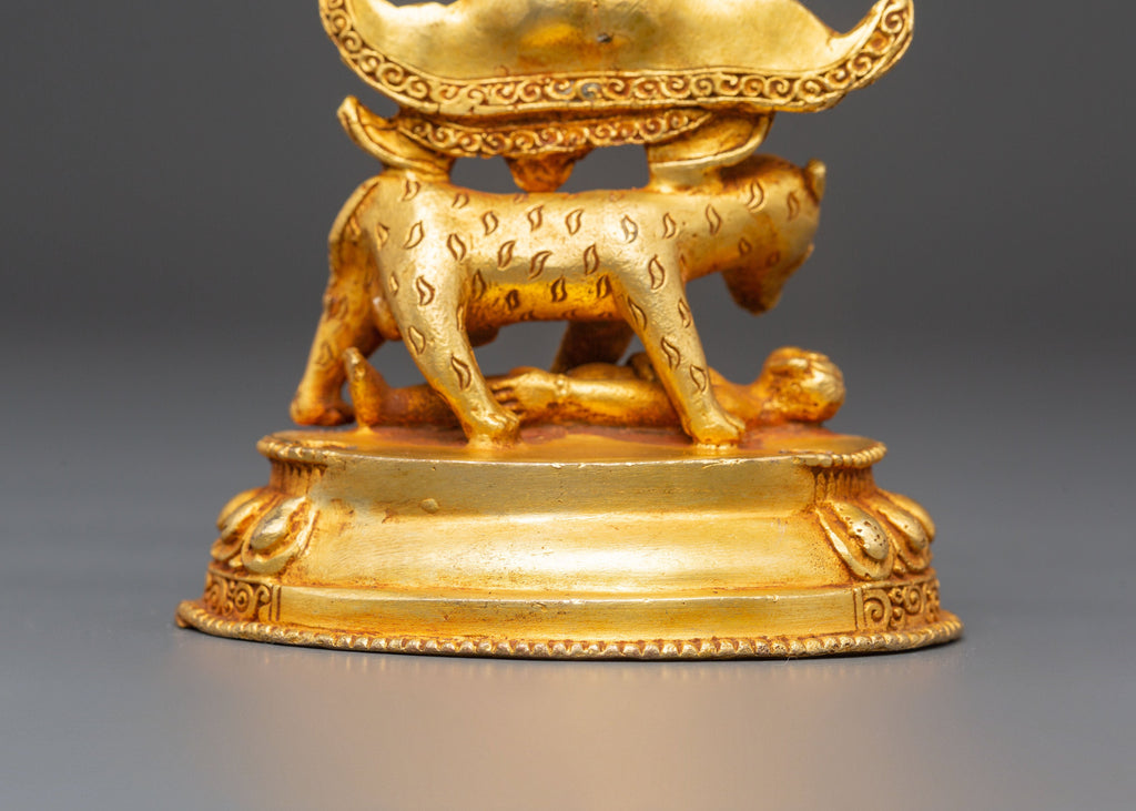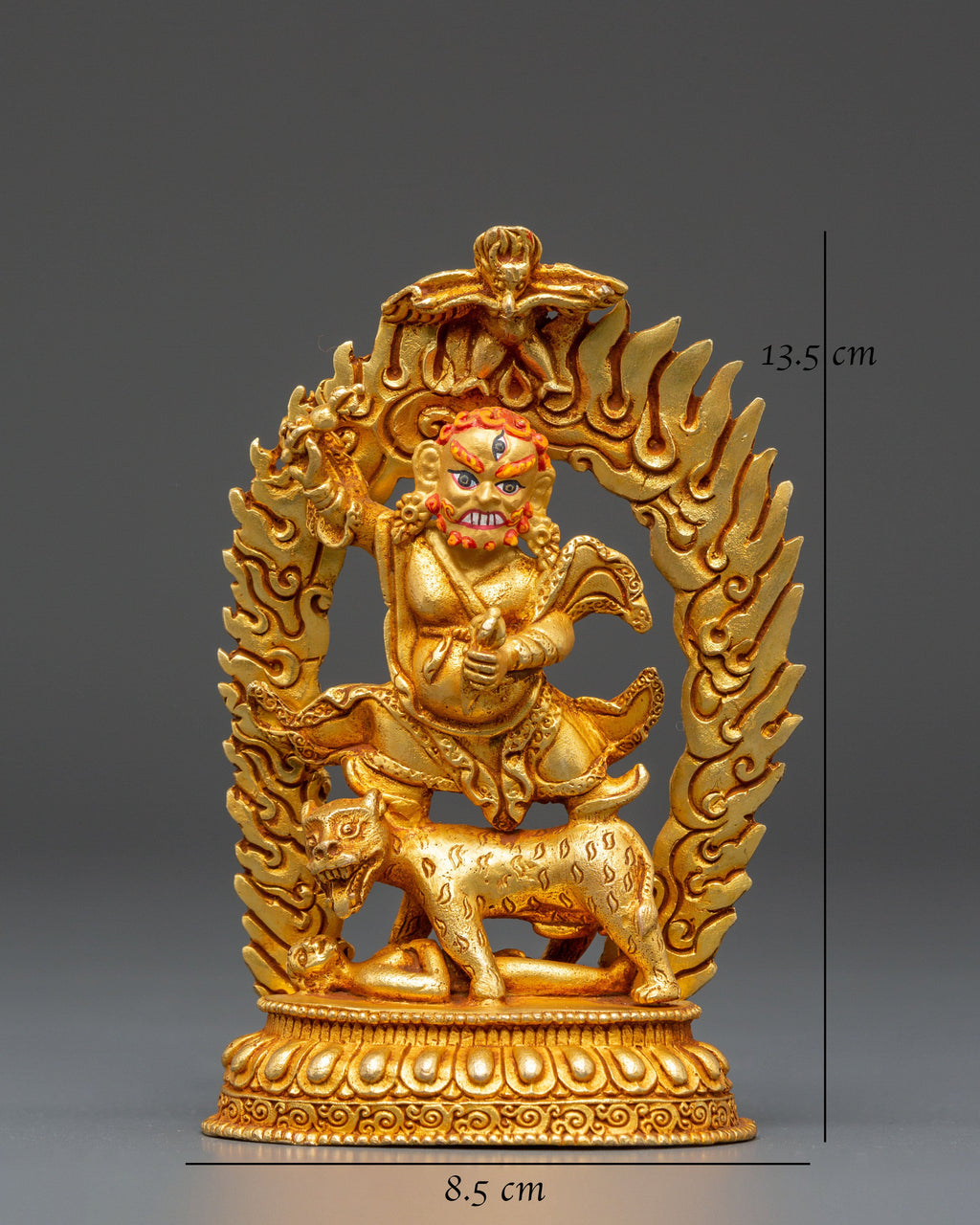 The Golden Dorje Drolo Statue shows one of Guru Padmasambhava's (Guru Rinpoche) eight forms, which are renowned as the ferocious embodiment of enlightened energy. Crafted from copper and beautifully gold-plated, this 13.5cm masterpiece exudes force and spiritual beauty. Dorje Drolo, with his concentrated gaze and powerful posture, is depicted riding a raging tigress, representing the defeat of negative forces and ego. His fiery halo symbolizes purifying fire, sacred settings, and the practitioner's spiritual journey.
