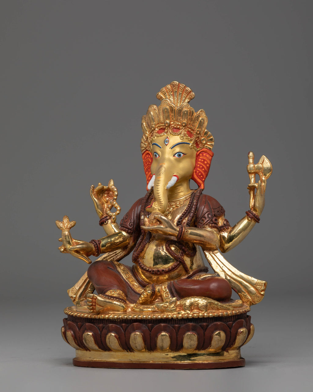 Introducing the exquisite Ganesh Statue, a beautiful blend of artistry and spirituality. Standing at 24cm in height and weighing 2.48kg, this statue is meticulously crafted with a copper body and gold plating. The statue is also enhanced with acrylic color, highlighting the intricate details and vibrant features of Lord Ganesh. Revered as the remover of obstacles and the god of wisdom and prosperity, this gold-plated Ganesh statue brings blessings and good fortune to any space.