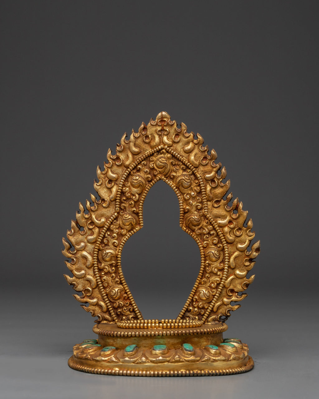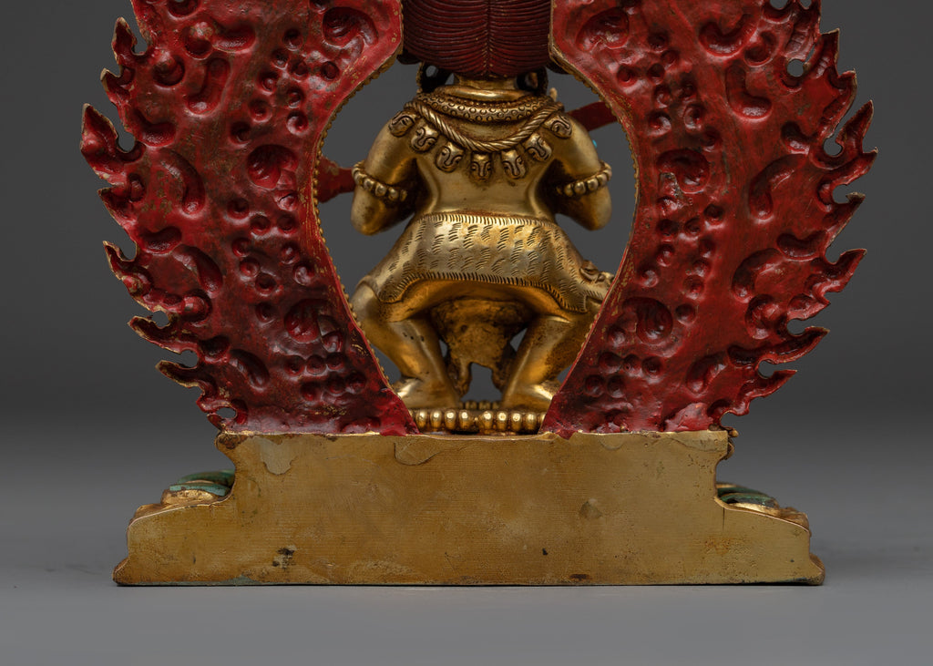 This fierce Golden Sakya Mahakala statue, also known as Sakya Mahakala, measures 8.1”/20.5cm in height and 6.5”/16.5cm at the base, with a weight of 1.16 kg. Made from copper with 24K gold gilding and featuring detailed gold and acrylic paintings, this piece embodies traditional artistry. Expertly handcrafted by skilled Nepali artisans, it brings a protective presence to altars, meditation areas, or spiritual collections.