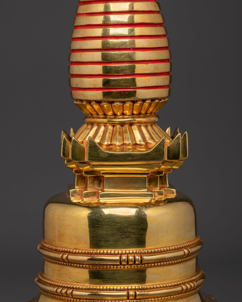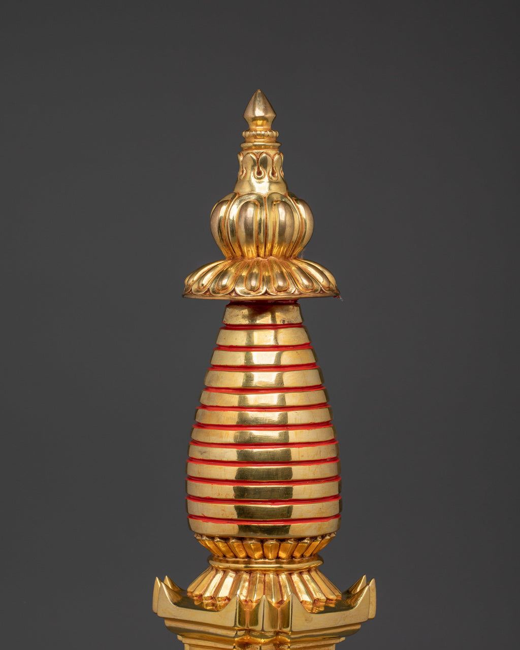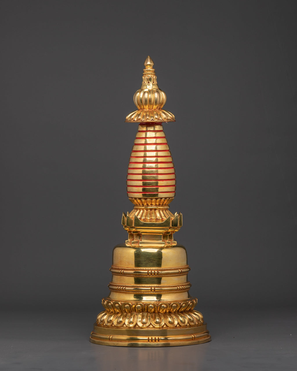 The Golden Sacred Stupa features a detailed design, with a beautifully shaped gold-plated top and intricate layers representing the levels of spiritual enlightenment. The central portion of the stupa features red and white stripes, symbolizing the physical and spiritual union in Tibetan Buddhism. The copper body, with its stunning gold plating, reflects the Buddha’s infinite wisdom and the radiant nature of the Dharma, while the circular base adds a sense of stability and grounding to the piece. The floral motifs around the base represent the blossoming of spiritual practice and the journey toward liberation.