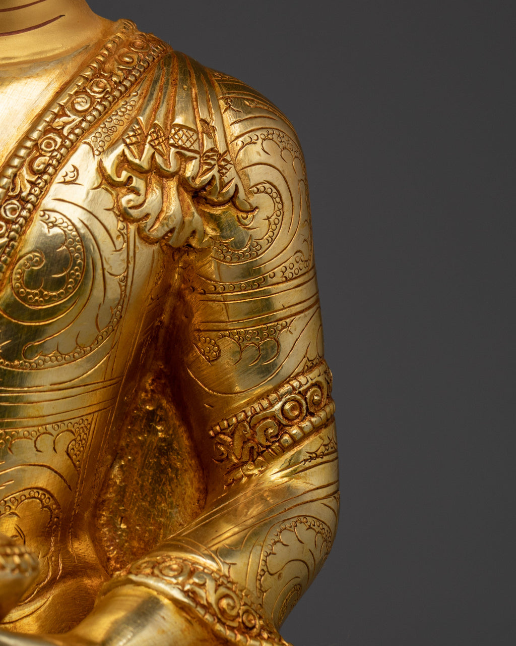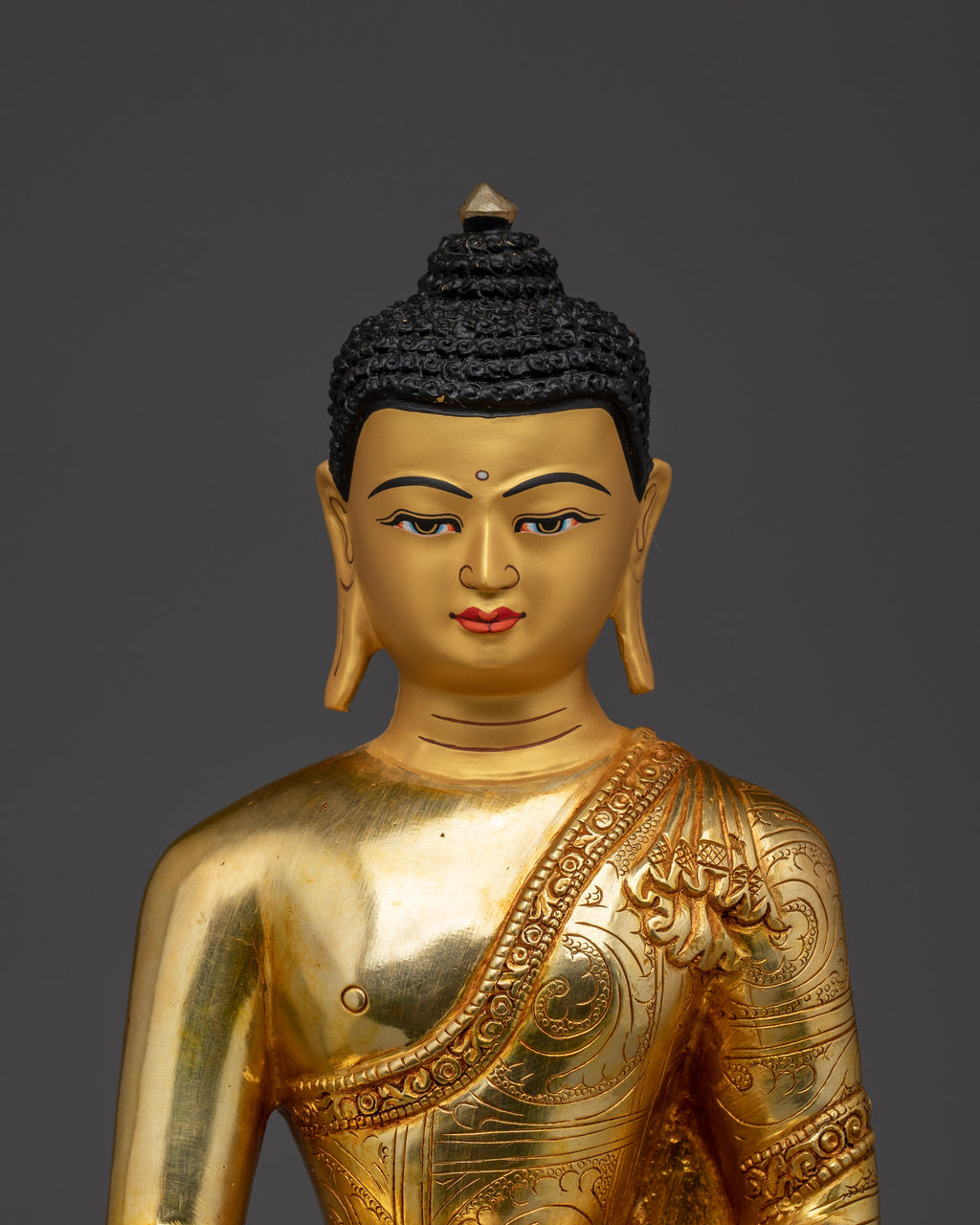 Shakyamuni Buddha is depicted in a calm, meditative state with half-closed eyes, embodying profound inner peace and an awakened presence. His right hand is in the bhūmisparśa mudrā (earth-touching gesture), signifying the moment he called the Earth to witness his enlightenment. His left hand holds an alms bowl, symbolizing renunciation and the simplicity of the monastic path. Atop his head rests the uṣṇīṣa, representing supreme wisdom, while his hair is styled in snail-like coils, referencing the well-known story of snails protecting him from the sun during prolonged meditation. He sits gracefully in the vajra posture on a moon disc lotus base, conveying stability, spiritual purity, and unwavering focus. This refined iconography honors the profound presence of the historical Buddha—serene, dignified, and deeply symbolic.