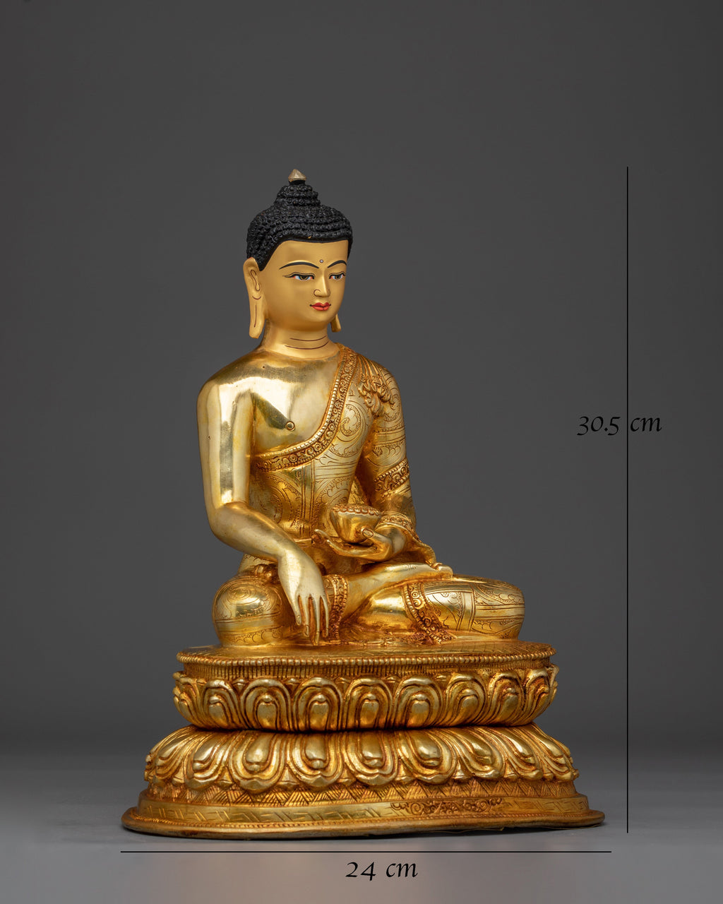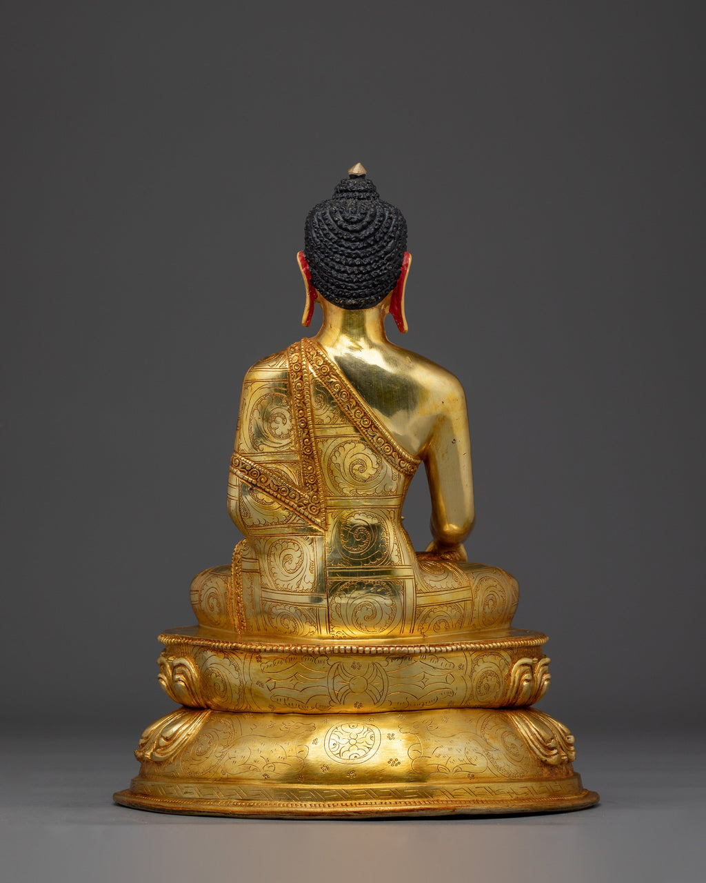 The Golden Serene Shakyamuni Buddha Artwork symbolizes the Buddha's deep teachings and the path to spiritual awakening. This handcrafted statue is 12" (Height) x 9.4" (Base) and weighs 3.75 kg. It is made of copper, decorated with 24K gold gilding, and enhanced with gold and acrylic paints. This sacred statue, created by expert Nepalese artisans, represents the craftsmanship of Himalayan Buddhism, making it an inspirational addition to altars, meditation places, or sacred collections.