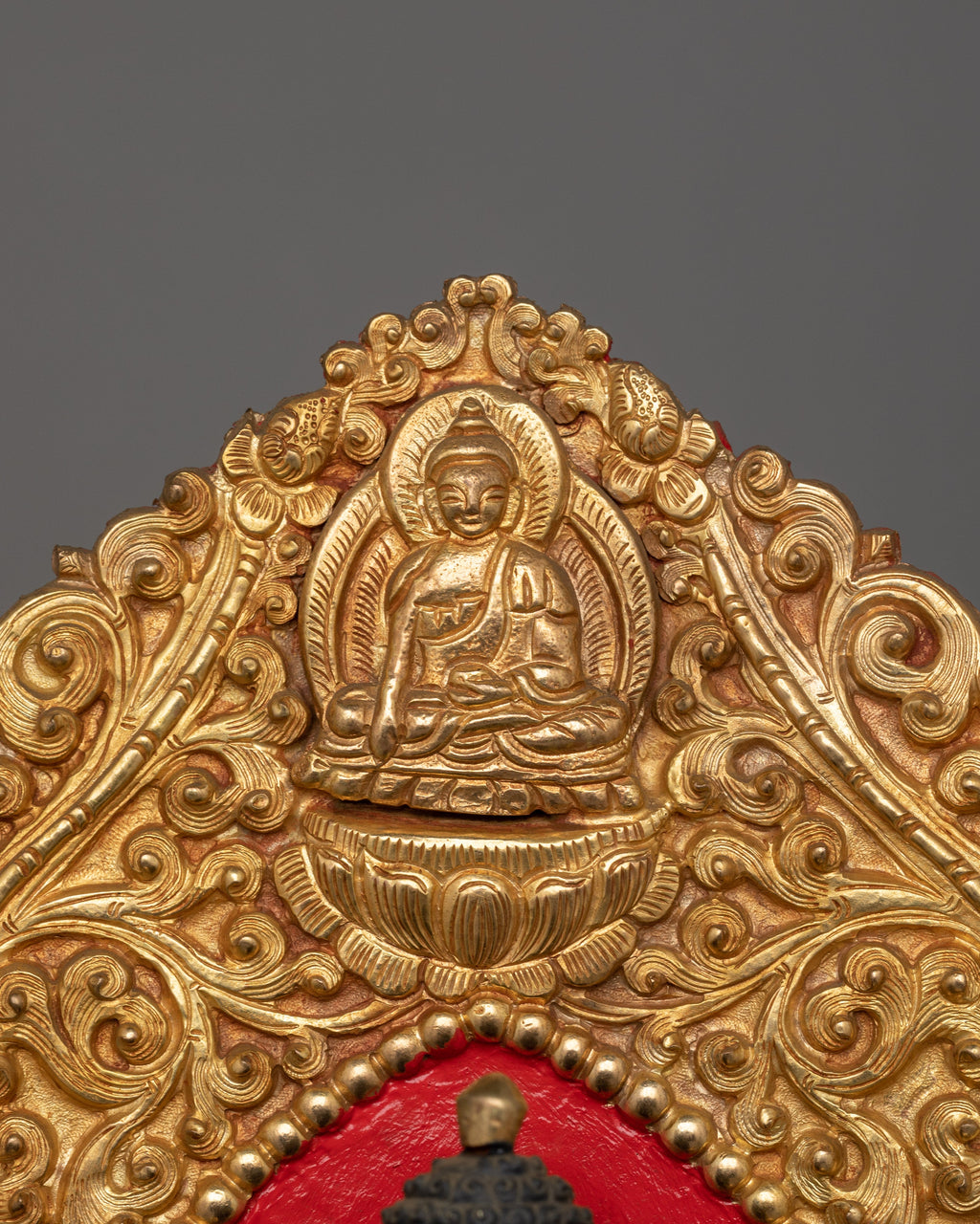 Shakyamuni Buddha is depicted sitting in the lotus pose (padmasana), indicating his steady concentration and mastery over the distractions of the material world. His right hand stretched toward the earth in bhumisparsha mudra, represents his moment of enlightenment, inviting the earth to witness his waking. The left hand, lying gently in his lap in dhyana mudra holding an alms bowl depicts the profound state of meditation and mindfulness that leads to insight and clarity.