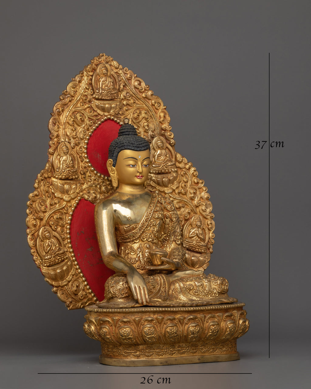 Crafted by expert Nepalese artisans, This Golden Shakyamuni Buddha Statue is sitting at a Size of 14.6”/37cm (Height) x 10.2”/26cm (Base) and Weight 4.11 kg. Sculpted from pure copper and adorned with 24K gold gilding, this statue showcases intricate gold and acrylic paintings. This sacred item embodies the rich traditions of Himalayan Buddhism, making it an important addition to altars, meditation areas, or sacred collections.