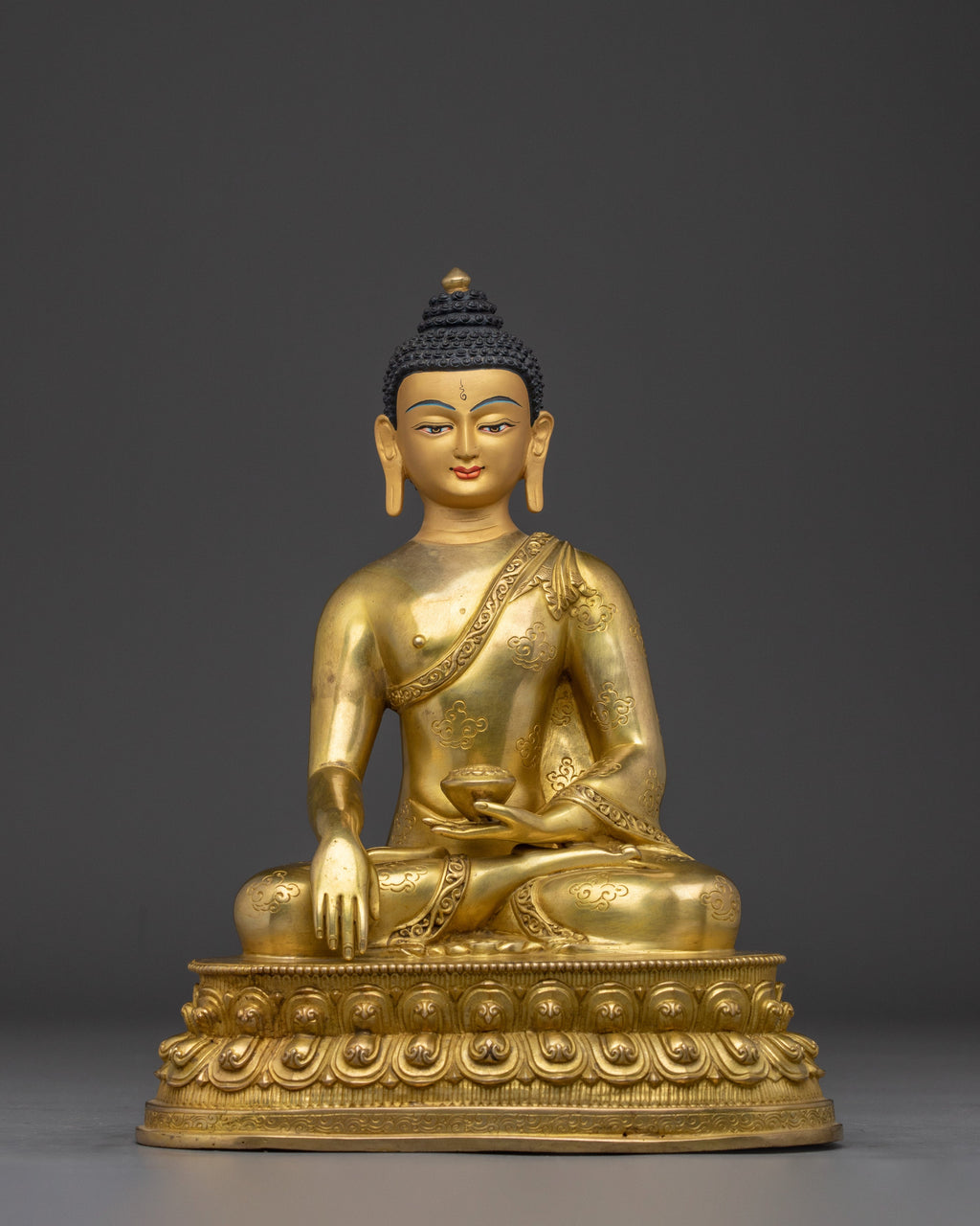 The Golden Shakyamuni Buddha - The Enlightened One symbolizes the Buddha's deep teachings and the path to spiritual awakening. This handcrafted statue is 11.4" (Height) x 9.1" (Base) and weighs 2.57 kg. It is made of copper, decorated with 24K gold gilding, and enhanced with gold and acrylic paints. This sacred statue, created by expert Nepalese artisans, represents the craftsmanship of Himalayan Buddhism, making it an inspirational addition to altars, meditation places, or sacred collections.