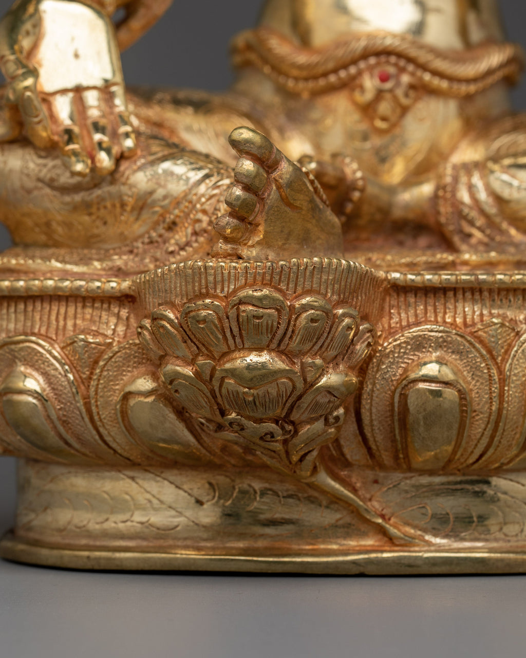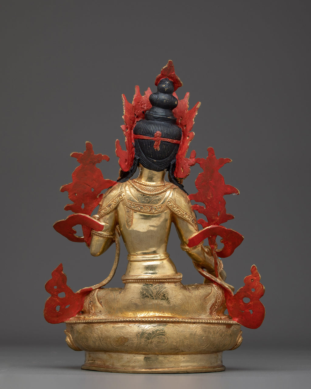 Shyama Tara, revered for her profound compassion and protective qualities, is shown seated gracefully with her right leg extended, symbolizing her willingness to take swift action for the benefit of others. She holds a lotus in her right hand, a symbol of purity and spiritual unfolding, while her left hand forms the Three Jewel Mudra, paying homage to the Buddha, Dharma, and Sangha. This hand also holds a lotus, representing ongoing spiritual evolution. Adorned with a crown of the Five Dhyani Buddhas, she embodies the five aspects of enlightened wisdom. Seated upon a lotus throne with a moon disc, her serene yet dynamic form expresses her compassionate commitment to aiding sentient beings on their journey toward enlightenment. The statue’s refined details capture her essence as a benevolent and responsive guide.