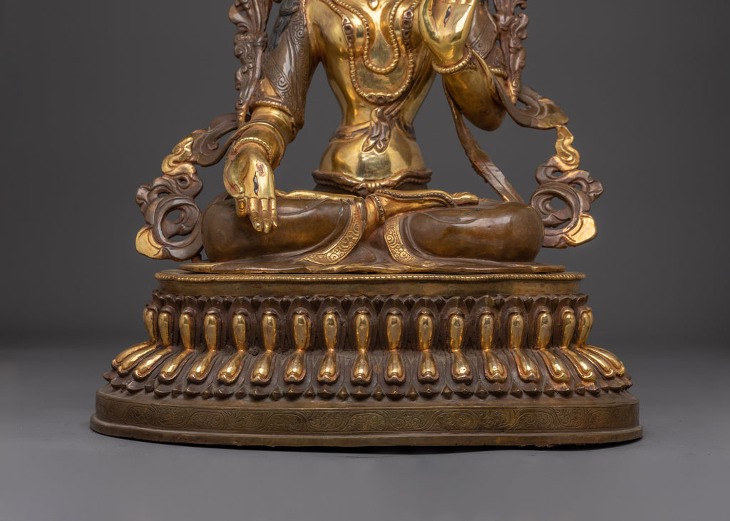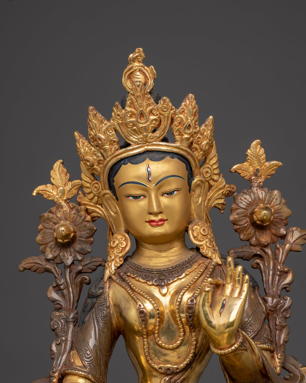 White Tara is depicted with seven eyes, which represent her caring alertness, and make her apart. Aside from the two usual eyes, she has a third eye on her forehead, one on each hand, and one on the soles of her feet. Her graceful appearance and elegant design make this statue a powerful symbol of healing, compassion, and protection, inviting longevity and good health to those who revere her.