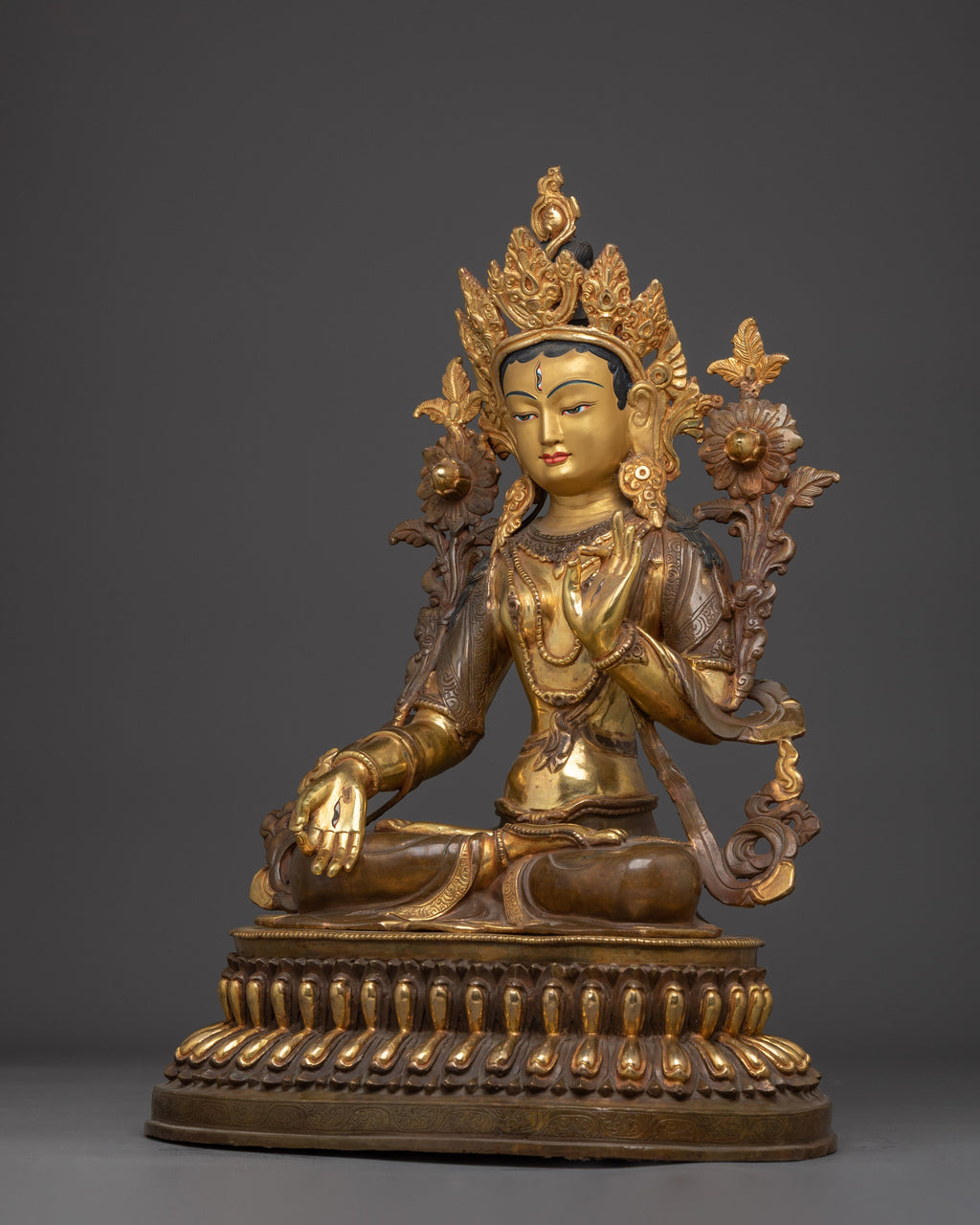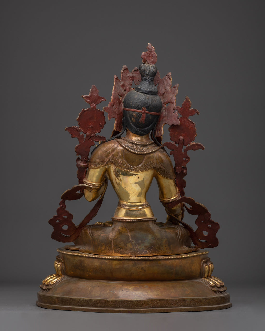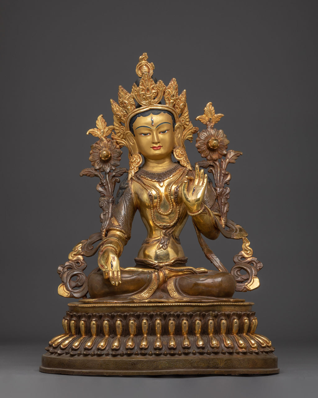 The Golden Sita Tara Tibetan Deity Art, a symbol of compassion, healing, and longevity, radiates divine grace and spiritual blessings. This wonderfully handcrafted statue, which measures 18.9" (Height) x 14.2" (Base) and weighs 9.34 kg, is made of copper, 24K gold gilding, gold, and acrylic paints. This figure, crafted by talented Nepalese artisans, symbolizes the spiritual traditions of Himalayan Buddhism, making it an important addition to altars, meditation places, or sacred collections.