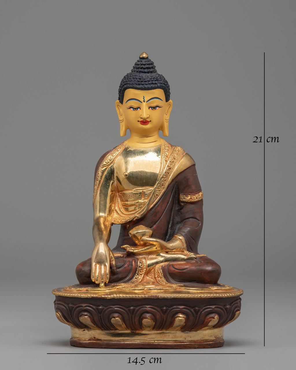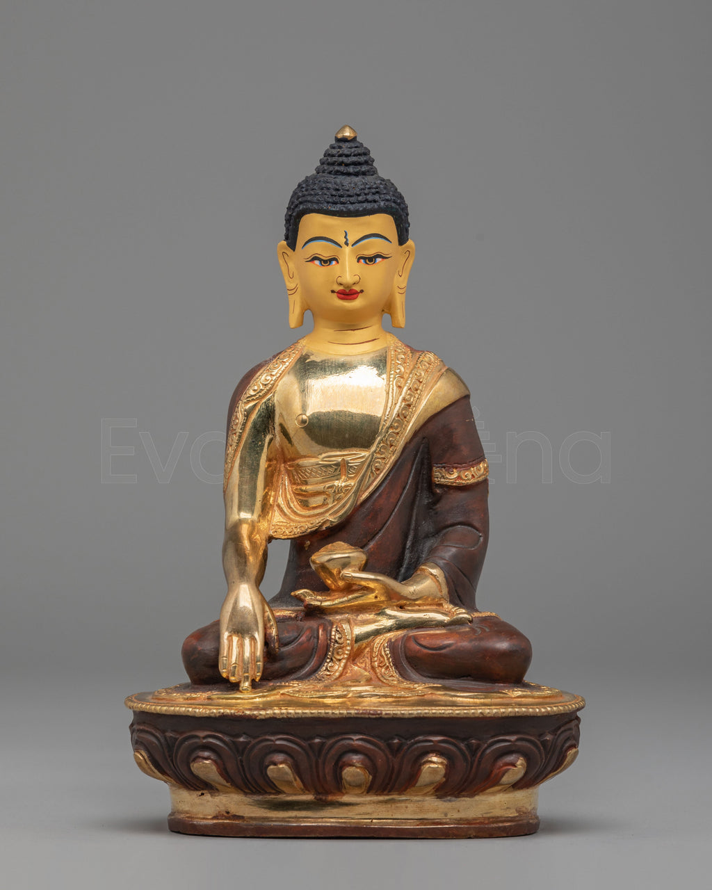This Golden Statue of Buddha Shakyamuni is a timeless item that promotes serenity, mindfulness, and spiritual progress. This magnificent statue, made of sturdy copper and accentuated with gold plating and brilliant acrylic color accents, depicts the Buddha's tranquil presence. Shakyamuni, the historical Buddha, is respected for his teachings on enlightenment, compassion, and the way to freedom from suffering. This intricately sculpted statue symbolizes his serene personality and profound wisdom, making it an excellent addition to any spiritual room or meditation place.