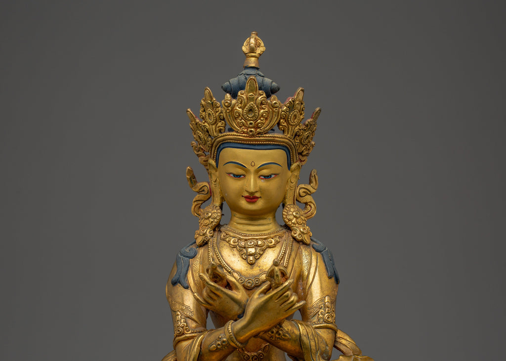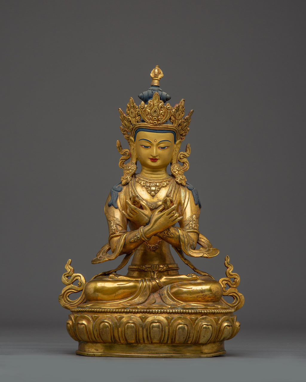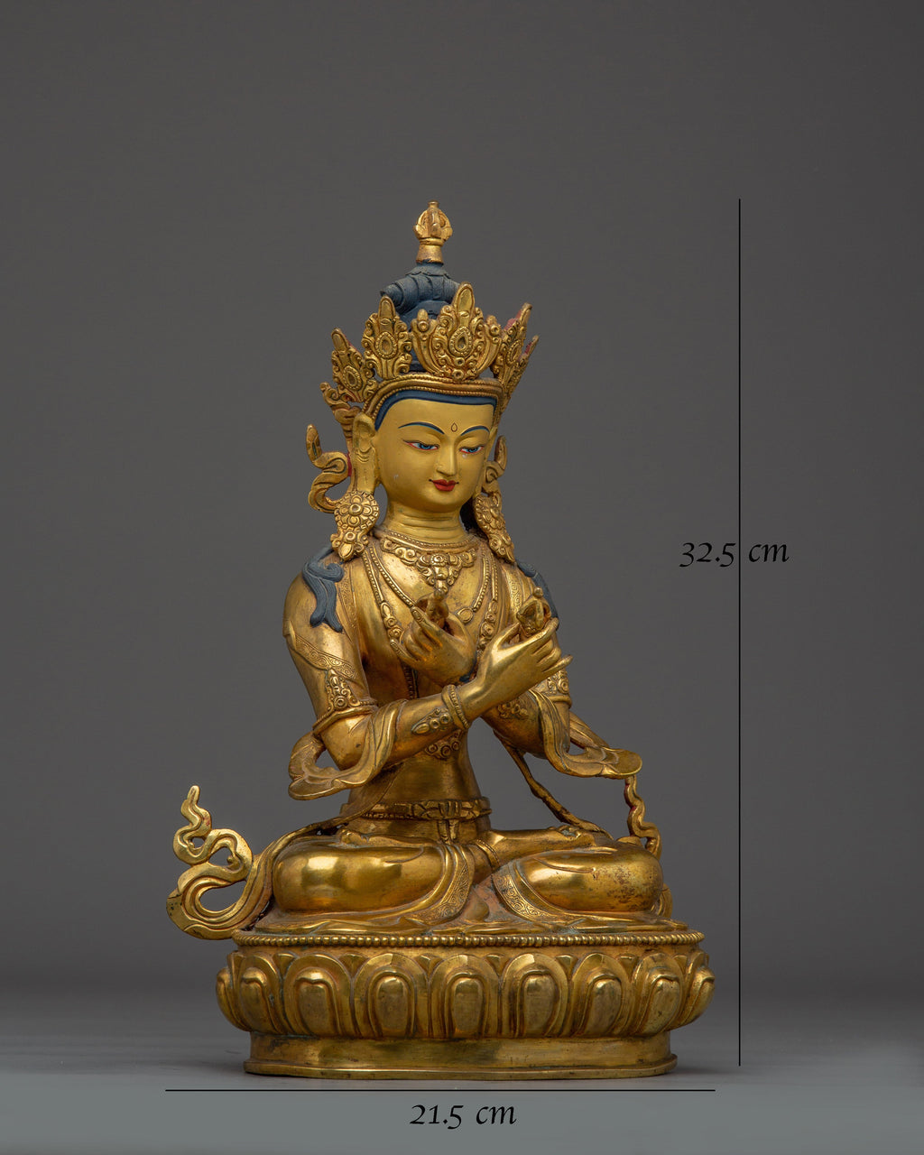 Vajradhara stands at the heart of Vajrayana Buddhism as the embodiment of dharmakaya—the ultimate essence of all existence. Adorned with a five-pointed crown symbolizing the Five Wisdom Buddhas and topped with a tiny vajra, this golden statue captures him seated in the steady vajrasana pose atop a lotus base resting on a moon disc, a sign of purity. His serene face invites calm, while his hands form the embracing mudra, expressing harmony and unity. Clutching a bell in his left hand, he holds the emblem of emptiness and indestructible wisdom. This statue offers a graceful gateway to Buddhist teachings, blending tranquility with profound meaning.