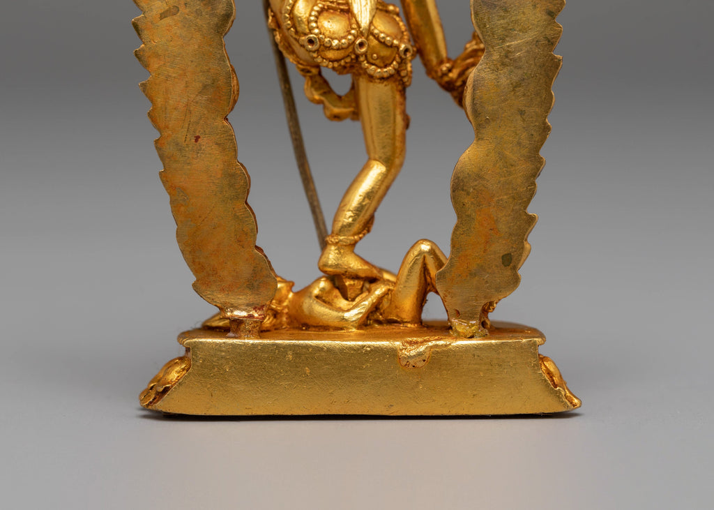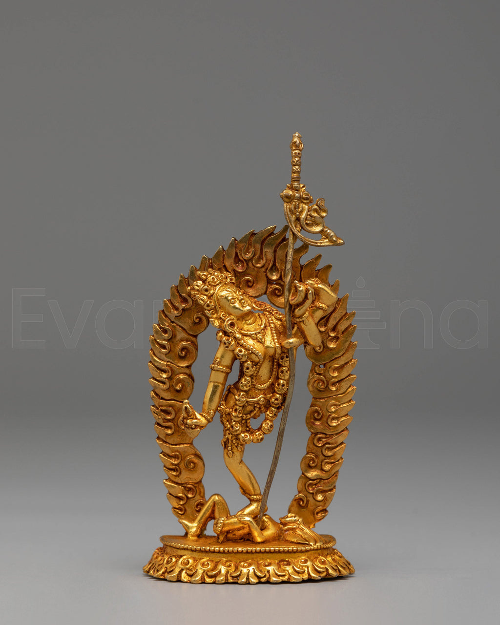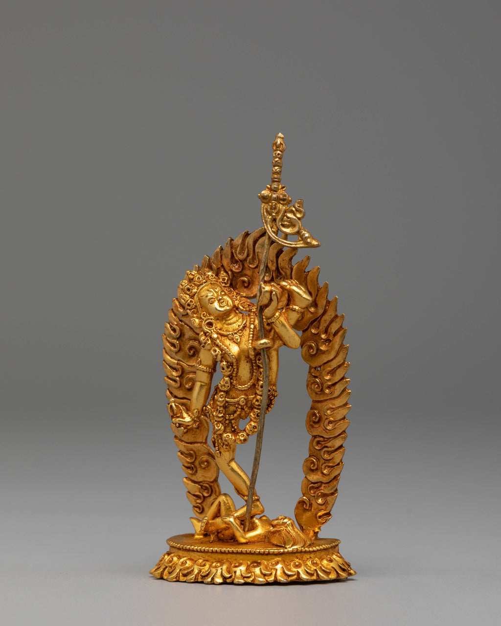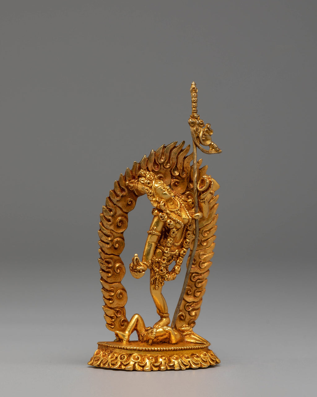 The statue captures Vajrayogini's fierce yet compassionate energy, standing with one leg raised and holding a vajra (symbol of indestructible power) in her hand. Her pose, draped in a traditional tantric costume, signifies her role in breaking attachments and offering spiritual transformation. The intricate details on her body, from the bejeweled crown to the fire-like halo, reflect the fierce and transformative nature of Vajrayogini. Her golden finish symbolizes purity, enlightenment, and the radiant energy she emits to dispel ignorance and obstacles.