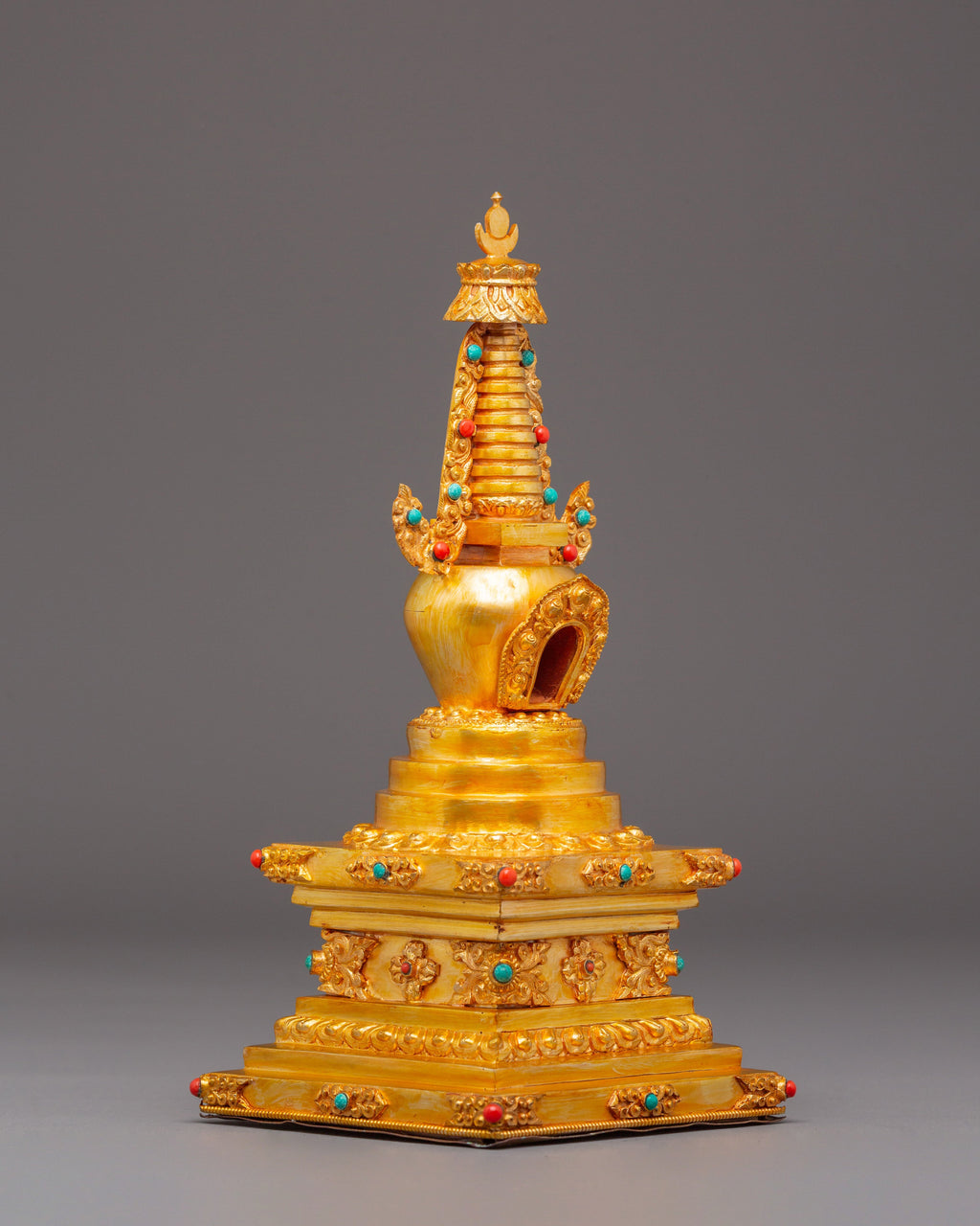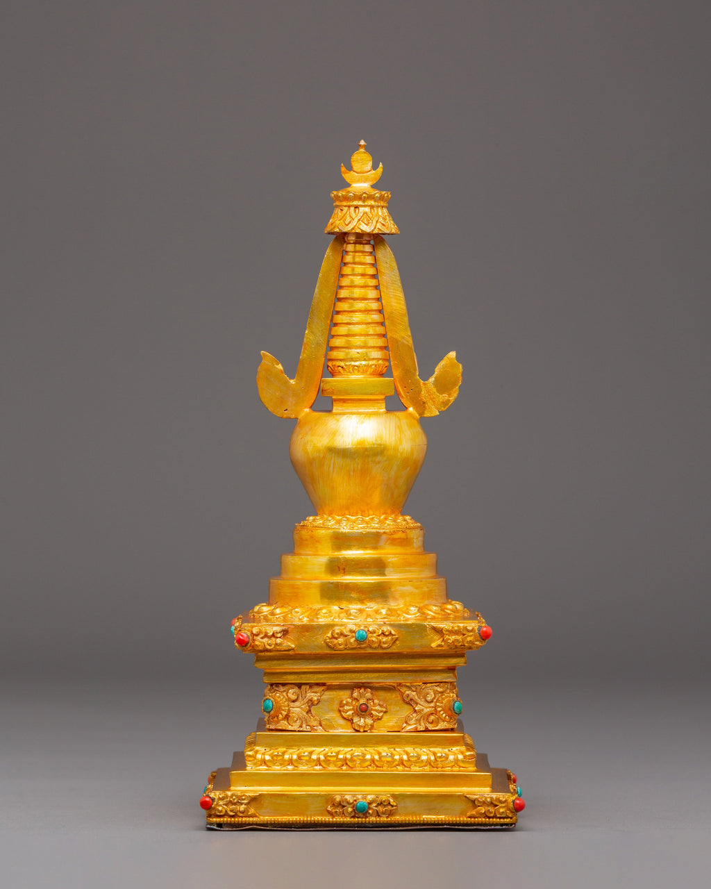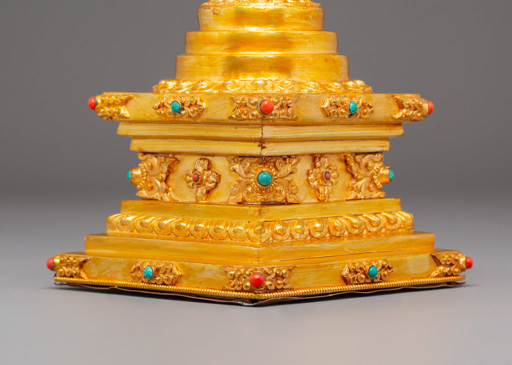 Golden Stupa for Altar | Gold Plated Copper with Coral & Turquoise Stones