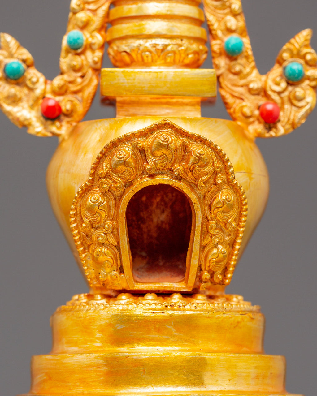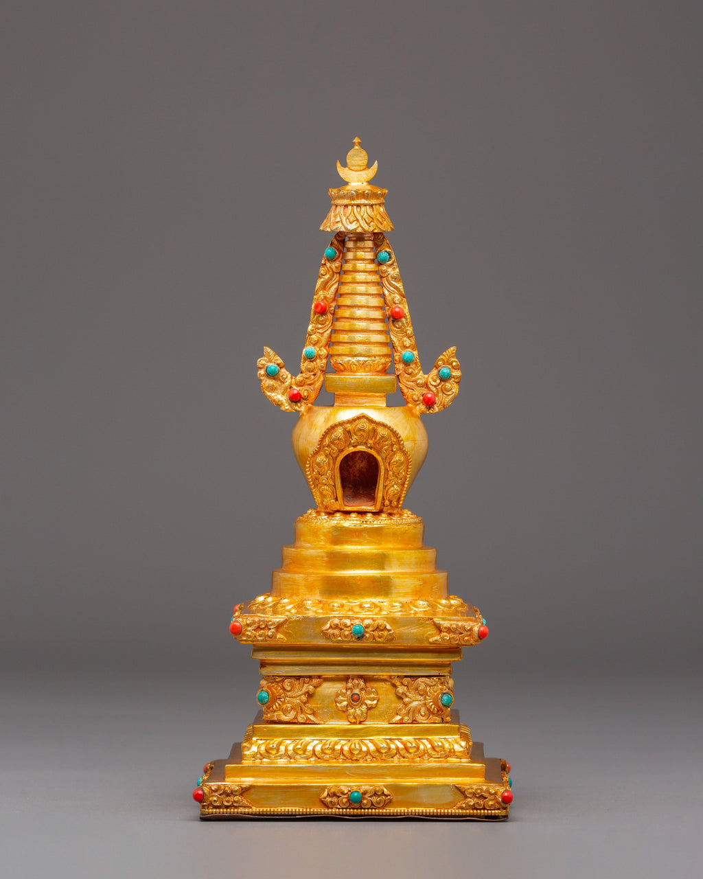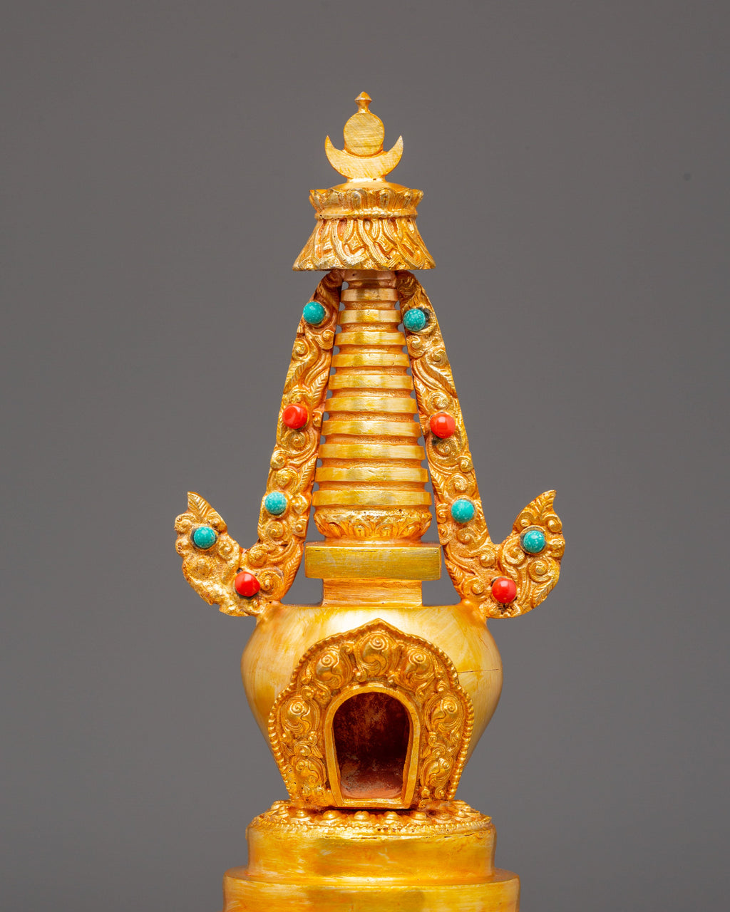 Golden Stupa for Altar | Gold Plated Copper with Coral & Turquoise Stones