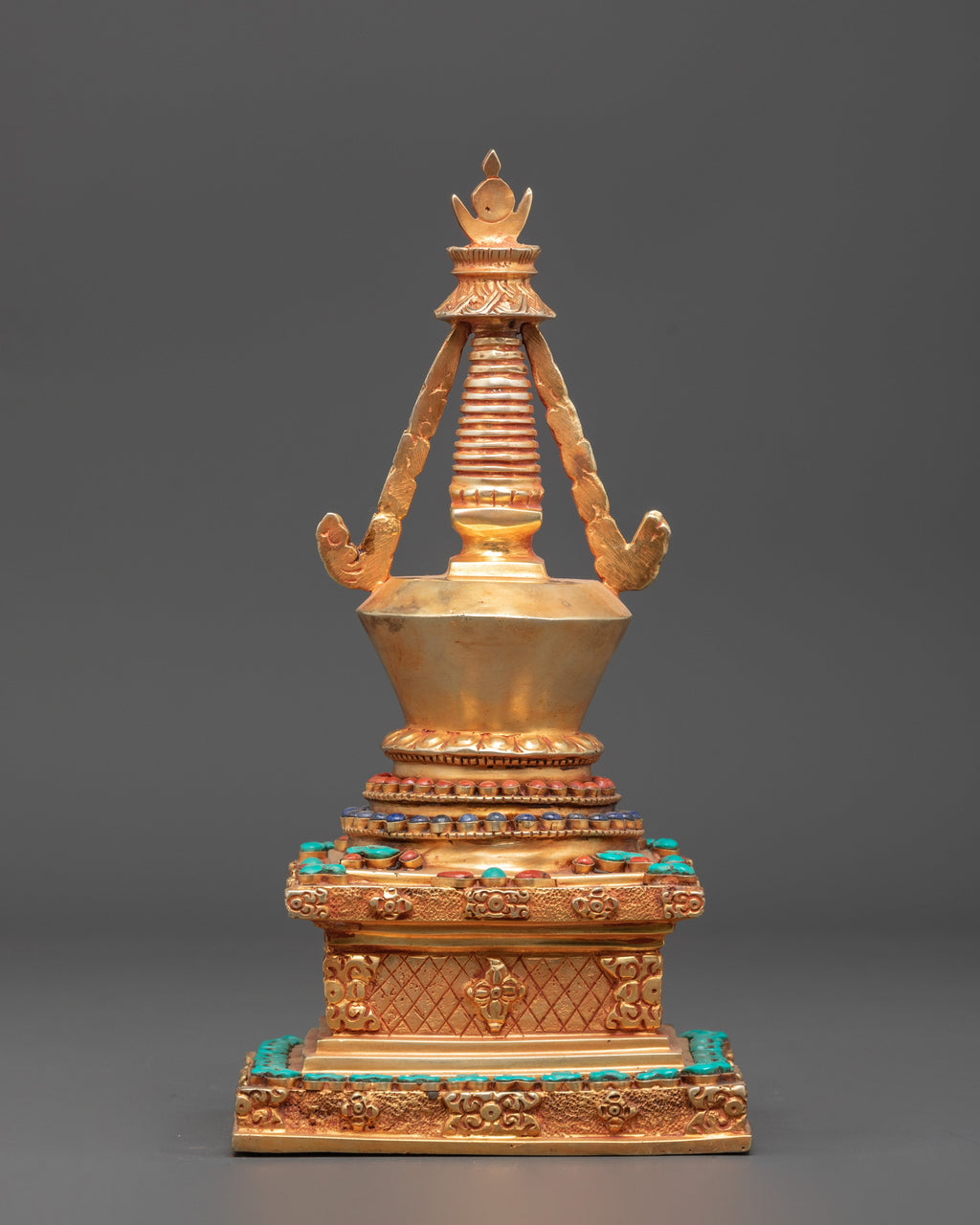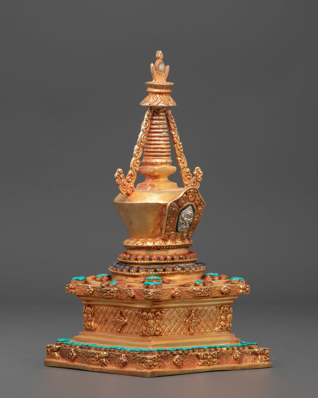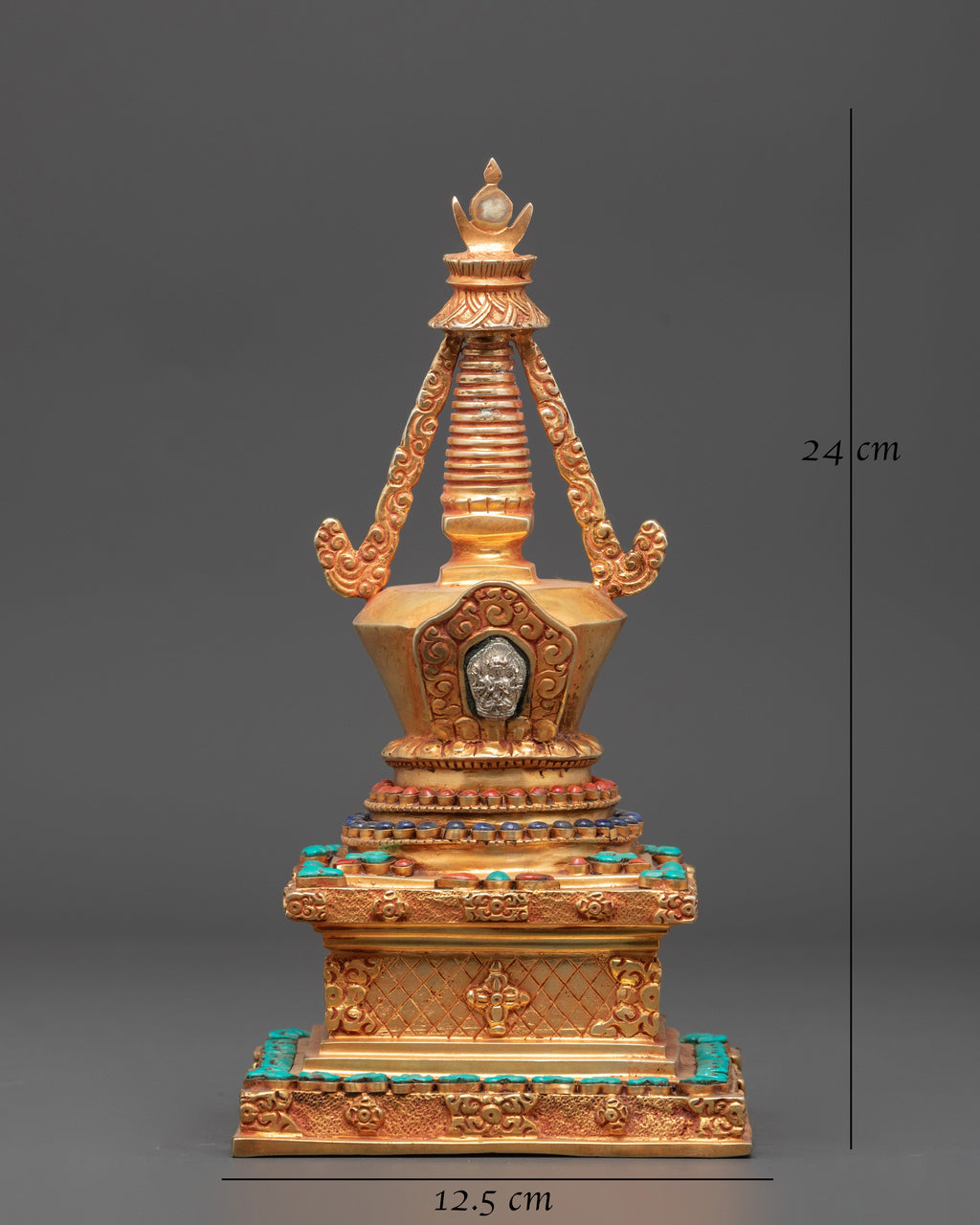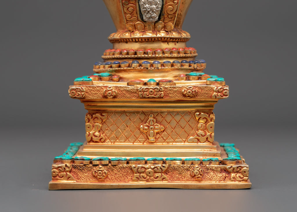 In Tibetan Buddhism, the stupa (or chorten) represents both the Buddha's enlightened intellect and the cosmic structure of the universe. It is thought that putting a stupa in one's home or temple provides tranquility, prosperity, and spiritual advancement. This Golden Stupa for Ceremonies exemplifies holy artistry while also acting as a powerful vehicle of blessings and spiritual transformation.