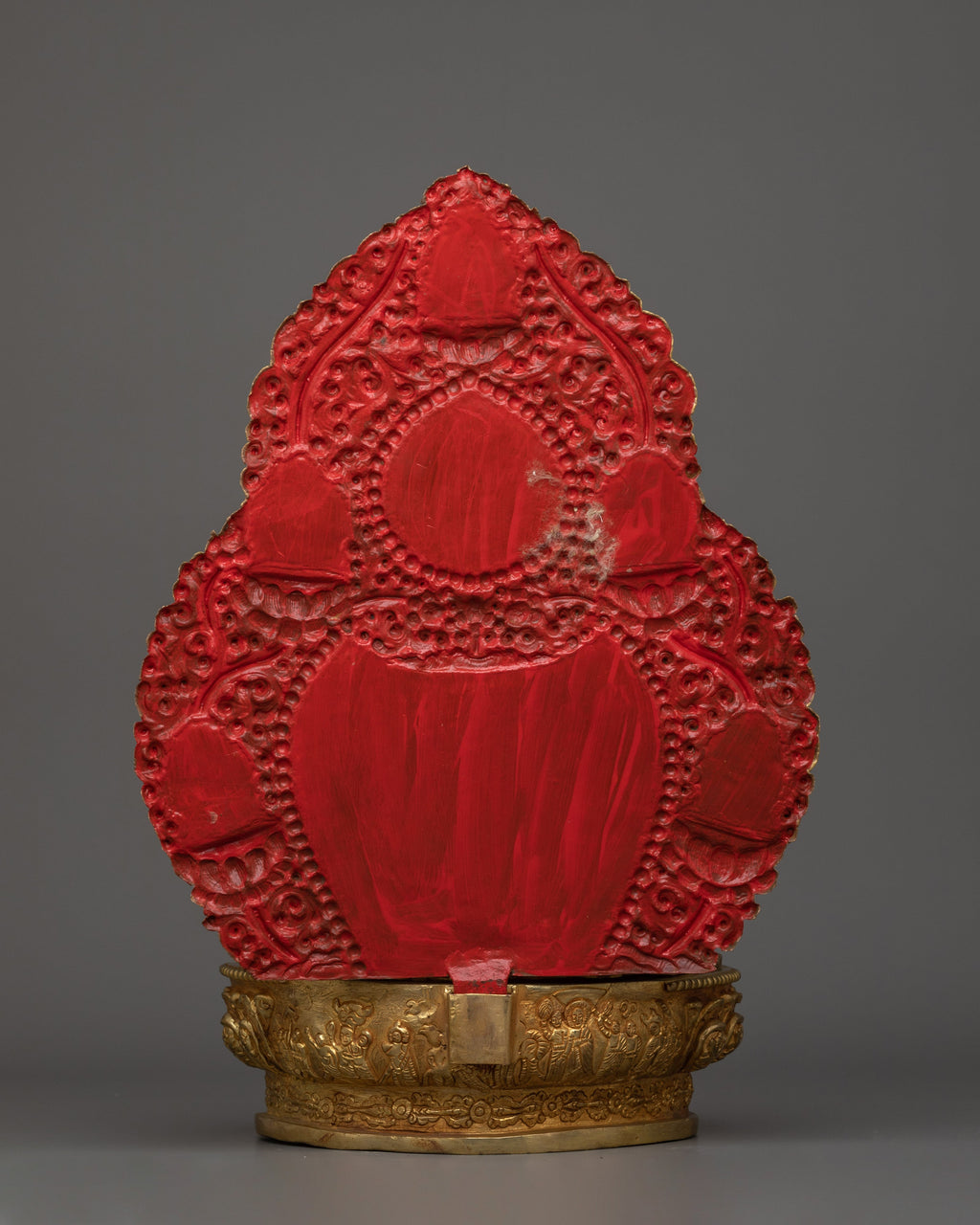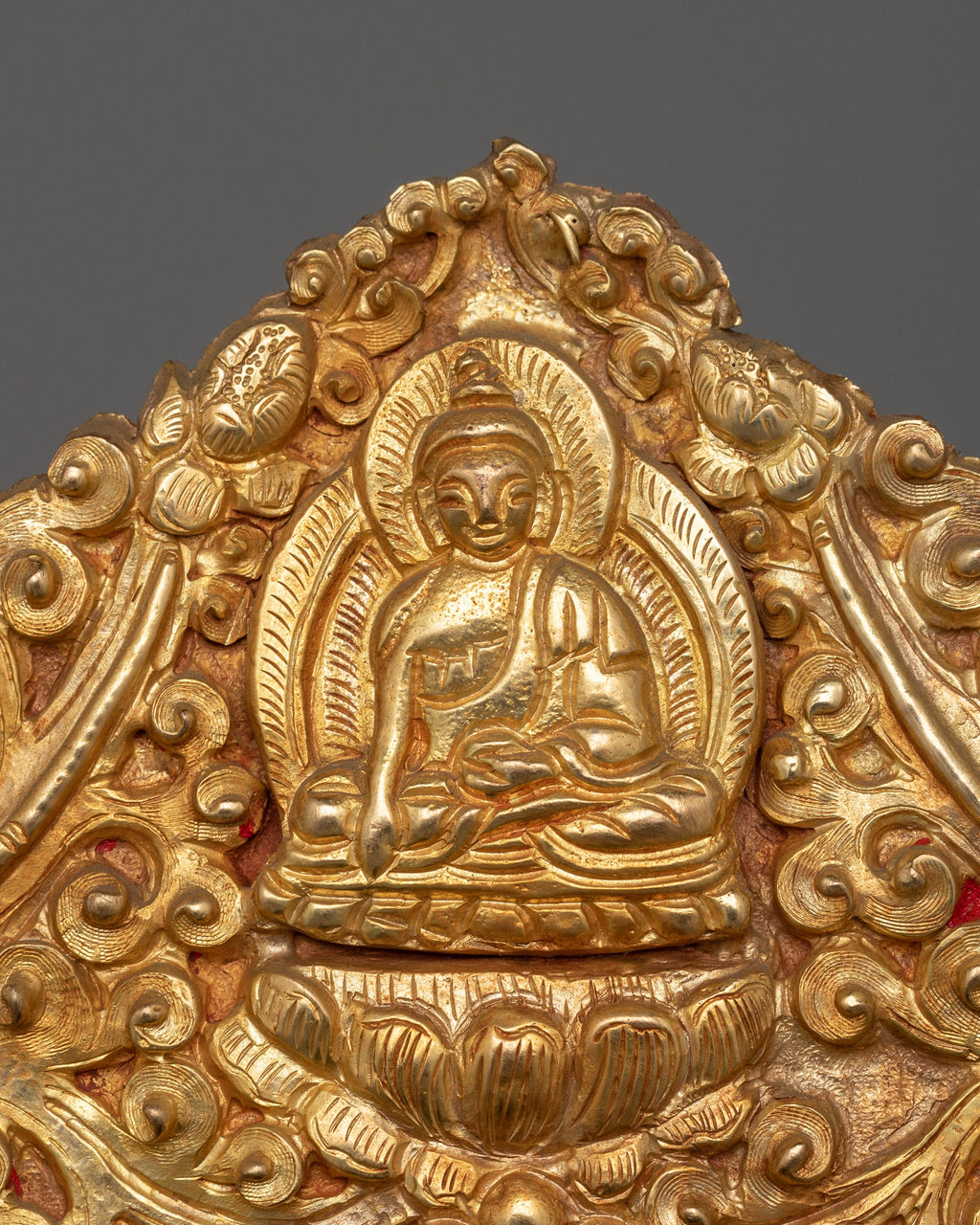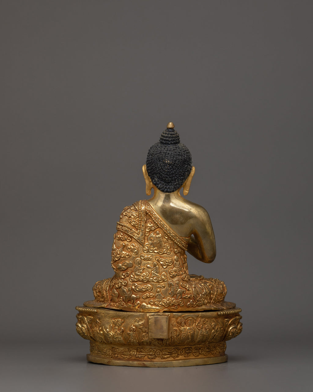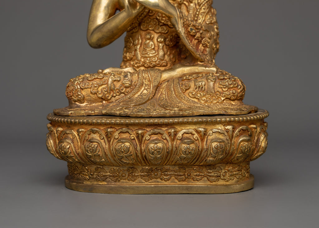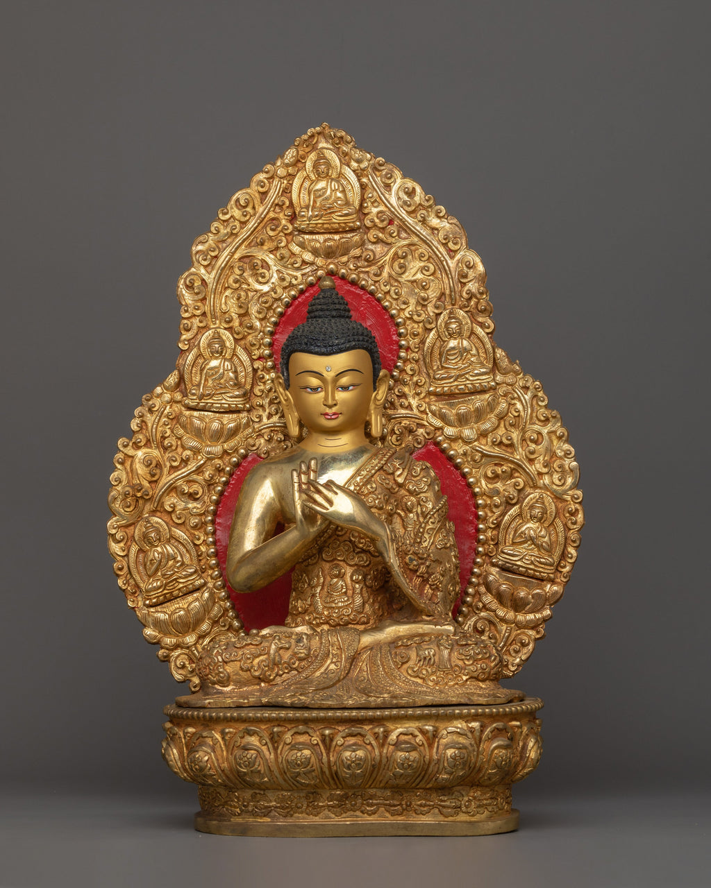 This Golden Vairocana Statue is the celestial Buddha embodying the Dharmakaya, symbolizing universal wisdom and enlightenment. This statue stands at a height of 14.6 inches (37 cm) with a base width of 10.2 inches (26 cm) and weighs approximately 3.77 kg. It is crafted from copper and adorned with 24K gold gilding, enhanced by gold and acrylic paintings, reflecting the rich artistic heritage of the Himalayan region. Crafted by expert Nepalese artisans, this statue is best for meditation and home decor.