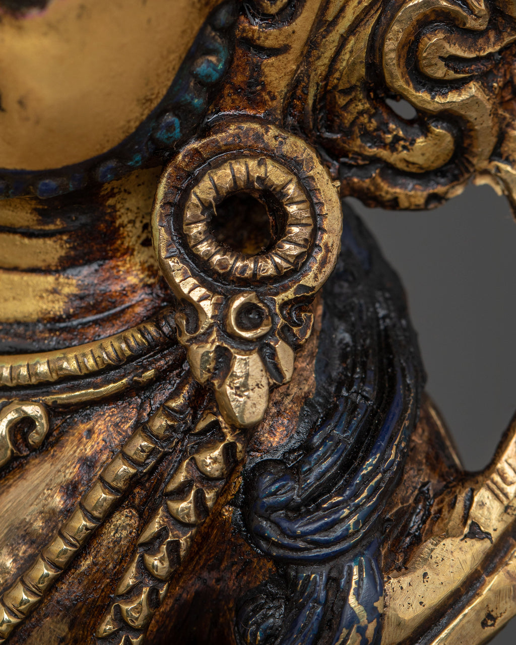 The deity's garment and ornaments are adorned with elaborate, hand-carved embellishments, showcasing traditional Newar craftsmanship. The statue's holy presence is enhanced by its beautiful golden tint and tiny touches of acrylic color. Dzambhala's left hand holds a mongoose, an auspicious emblem thought to spit gems and wealth, while his right hand represents charity. This 22.5cm copper statue is ideal for a home altar, meditation space, or as a spiritual gift. It brings balance, protection, and prosperity into your surroundings.